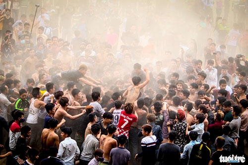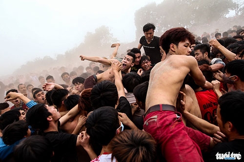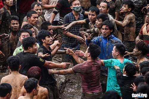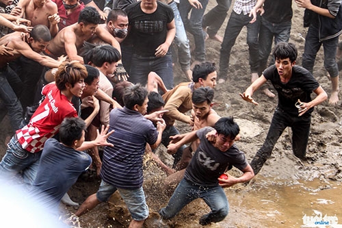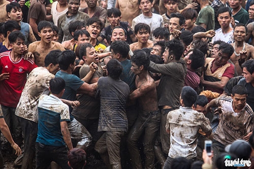 | Các nhóm thanh niên được tổ chức theo xóm, mỗi xóm từ 10 đến 20 thanh niên tranh giành phết - Ảnh: Nguyễn Khánh |
