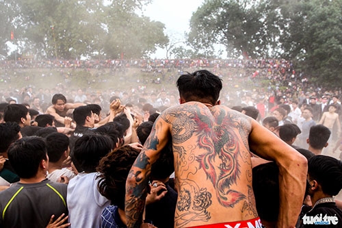 | Một thanh niên xăm hình rồng phượng chuẩn bị lao vào đám đông để cướp phết - Ảnh: Nguyễn Khánh |