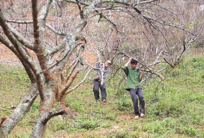 "Gia đình trồng 50 gốc đào, dịp này đã bán 10 gốc 16 năm tuổi (chặt cả cây, để lại gốc rễ) với giá 5 triệu đồng mỗi gốc. Vụ thu hoạch tiếp theo phải chờ 3-5 năm nữa", ông Mè Văn Đan (bản Bó Sập, xã Lóng Sập, Sơn La) cho biết. |