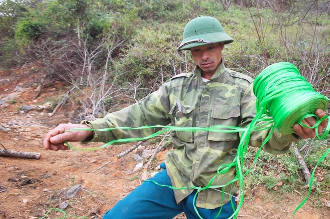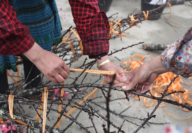Với công việc chằng buộc cành đào từ sáng đến tối, người dân địa phương có thể kiếm được 100-150 nghìn đồng mỗi ngày. |