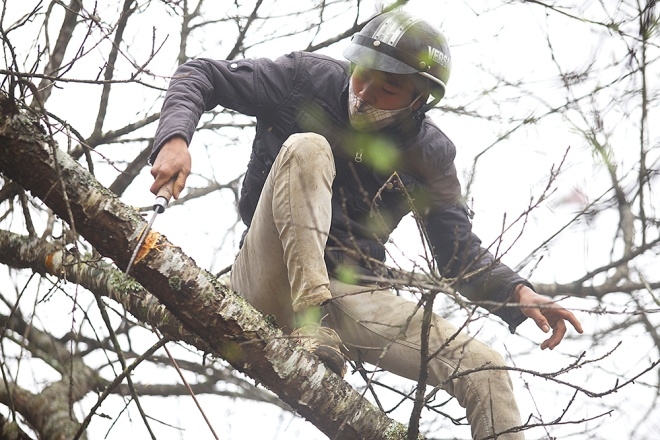 Tại bản Pà Cò (tỉnh Hòa Bình), người đàn ông dùng dao chặt một cành đào hơn 6 năm tuổi. Anh cho biết "đào rừng là nguồn thu nhập chính của gia đình trong dịp Tết". |