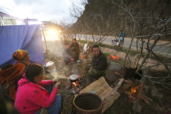 Hai gia đình người Mông dựng lều bên đường để bán đào. Ngồi co ro trong giá lạnh, anh Giàng A Sinh cho hay phải đi xe máy 160 km lên tận Tà Xùa (Bắc Yên, Sơn La) để mua đào về bán, giá mỗi cành dao động từ 400 nghìn đến 5 triệu đồng. |