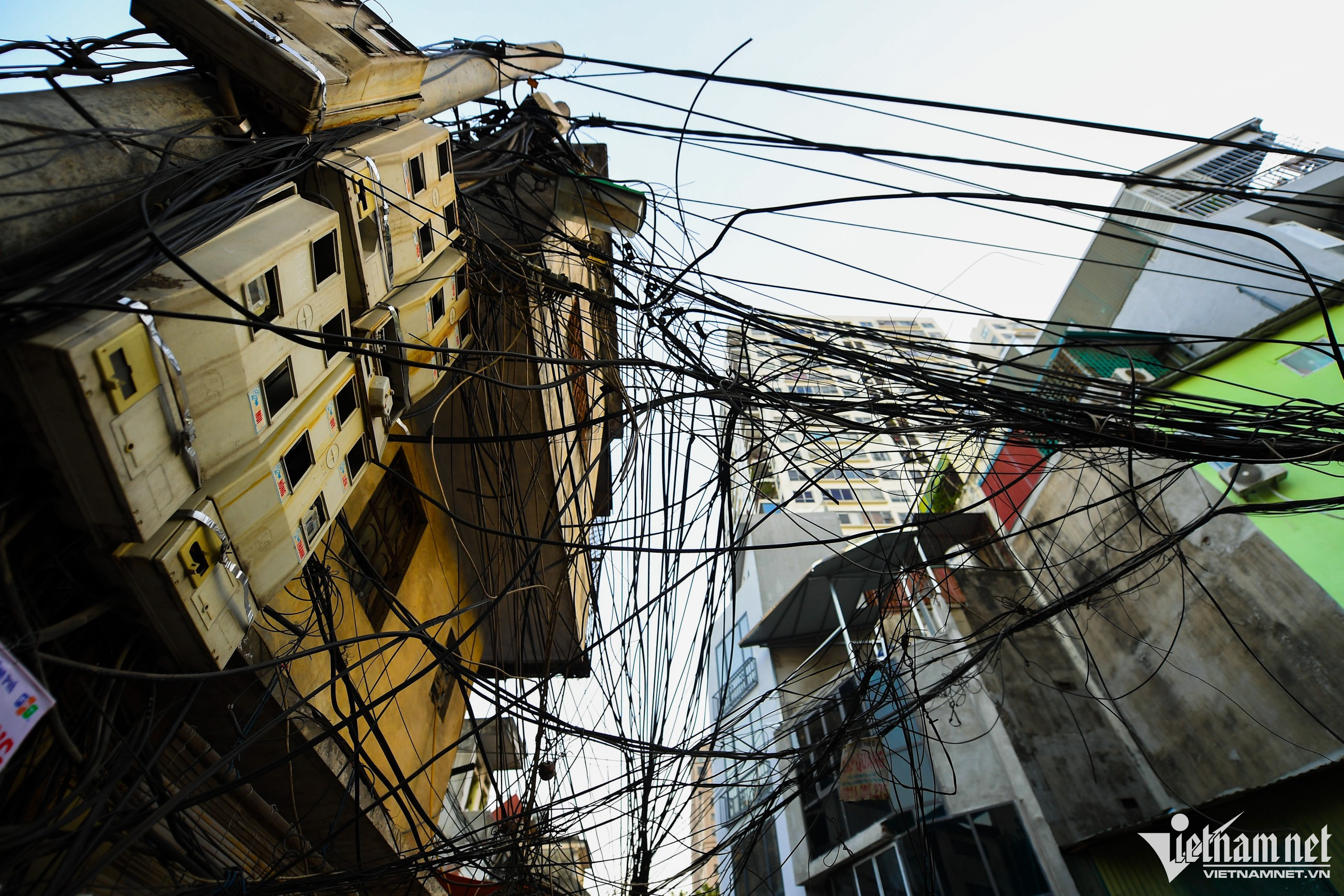 Dù đã hạ ngầm dây diện, cáp viễn thông nhưng ở nhiều tuyến phố và khu dân cư tại Hà Nội, cảnh "rác trời" chằng chịt, rối tung vẫn xuất hiện khắp nơi, gây nguy hiểm cho người qua lại.