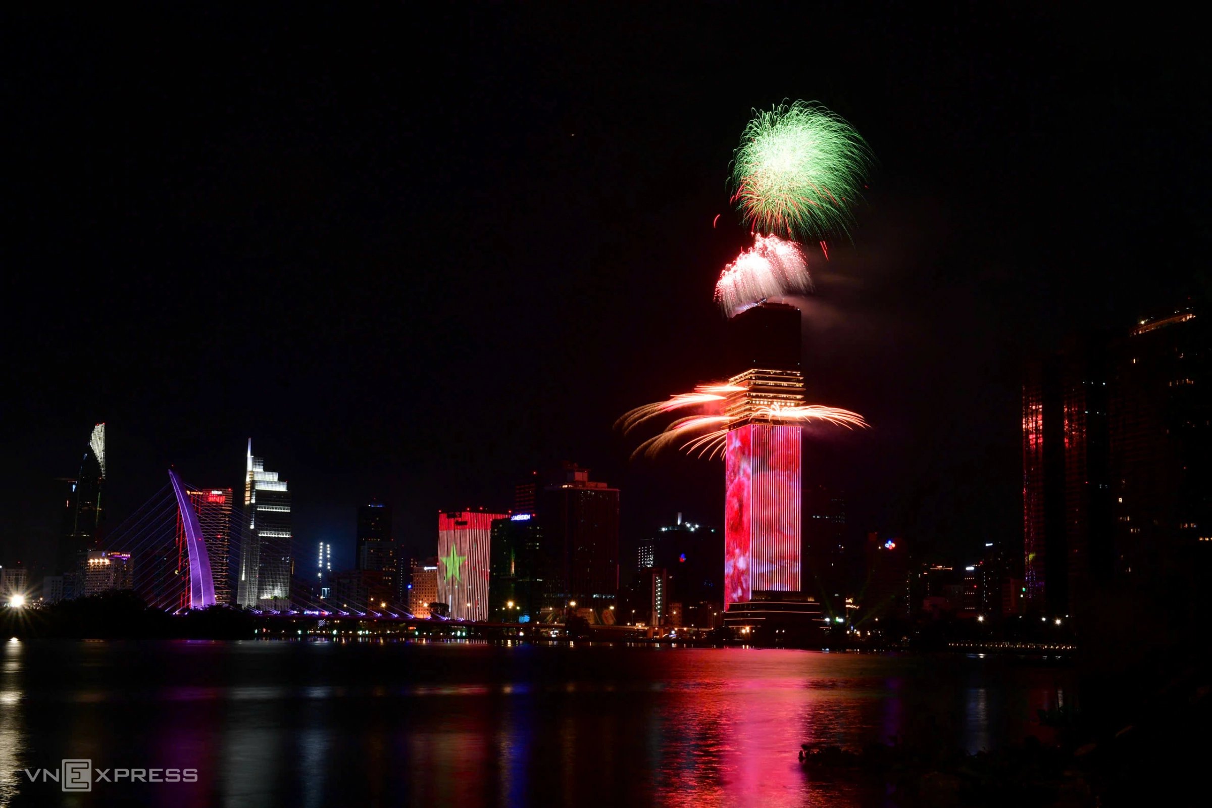 Hàng vạn người đổ về Công viên ven sông Sài Gòn và Bến Bạch Đằng để chiêm ngưỡng những màn pháo hoa tầm cao mãn nhãn.