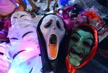 Mặc dù bị cấm nhưng nhiều gian hàng vẫn bày bán những chiếc mặt nạ kinh dị có xuất xứ từ Trung Quốc, thu hút nhiều người mua hơn so với loại truyền thống. Mỗi chiếc giá từ 100.000 - 150.000 đồng. |