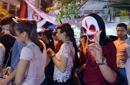 Một số thanh niên dạo chơi phố trung thu Hà Nội đeo mặt nạ kinh dị đi lại giữa dòng người khiến nhiều phụ nữ khiếp sợ.