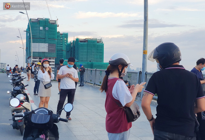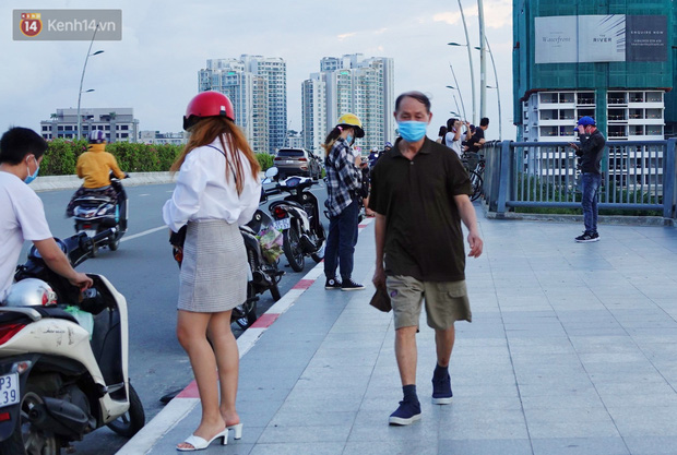 Trong khi đó ở cầu Thủ Thiêm, tuy đã có quy định cấm dừng đỗ xe, tụ tập trên cầu nhưng rất nhiều người đã phớt lờ quy định giãn cách, vô tư hóng mát, chụp ảnh..., có người còn không đeo khẩu trang vẫn di chuyển trên cầu.