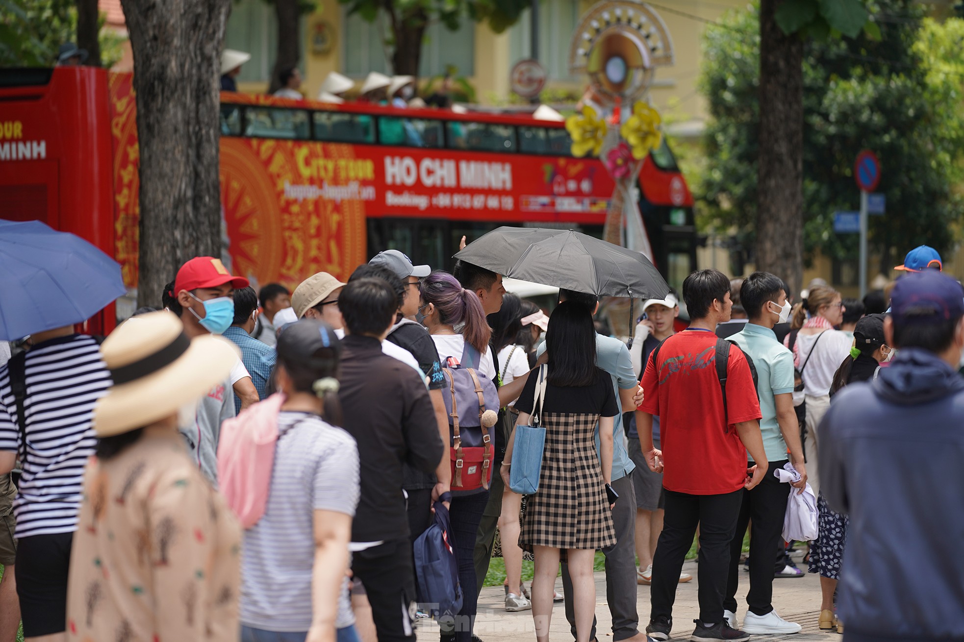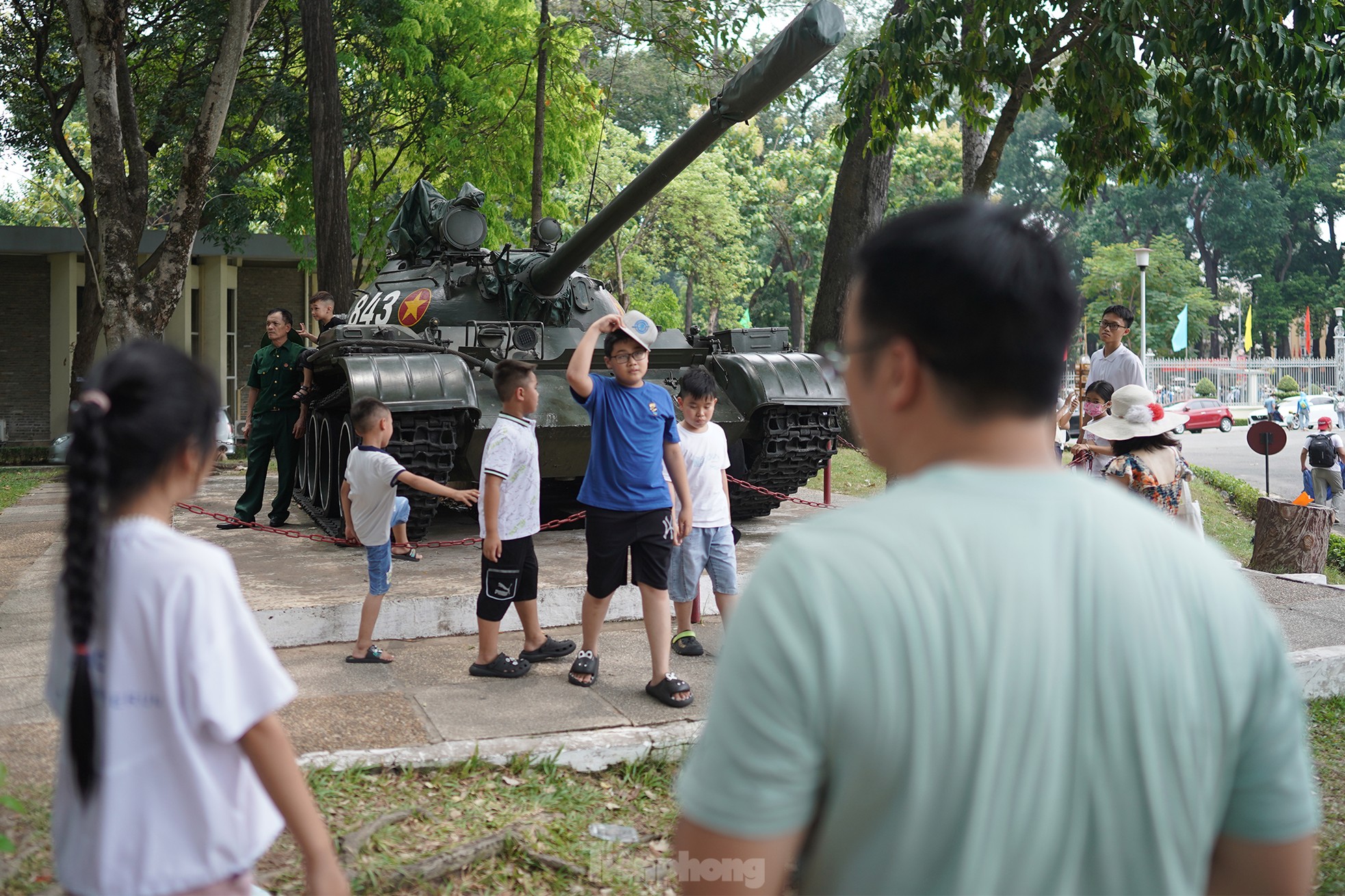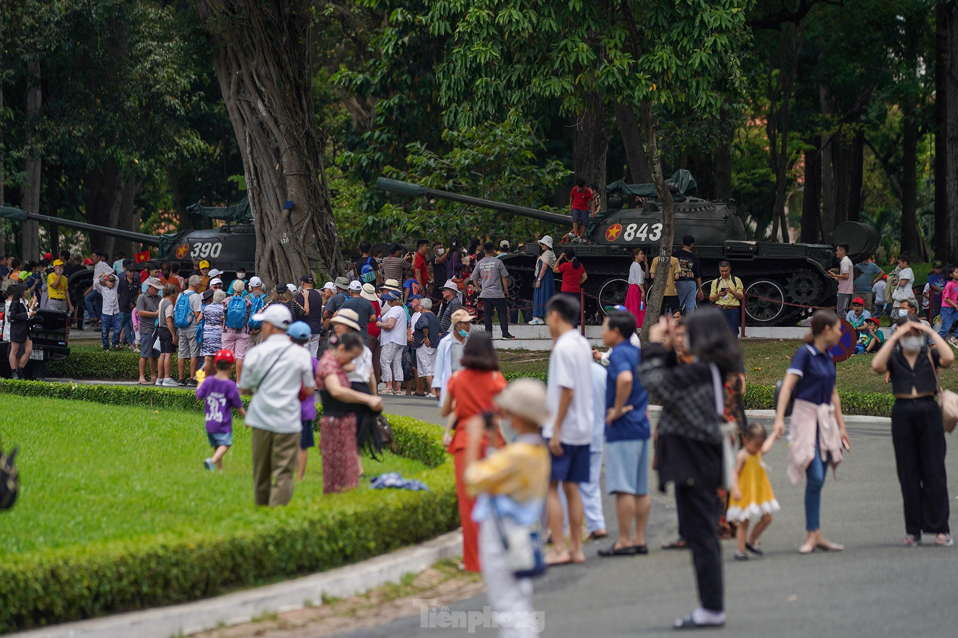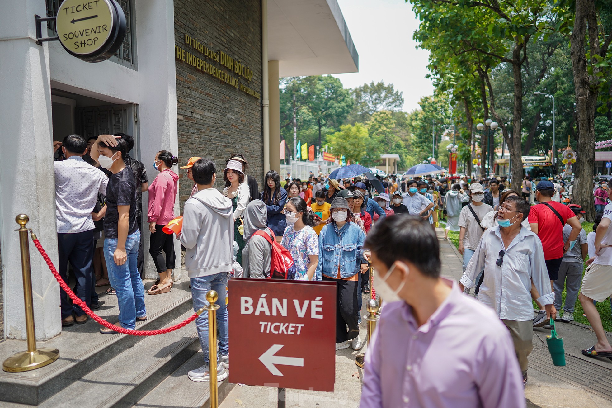 Đến 11h ngày 30/4, nhiều điểm vui chơi giải trí ở hội trường Thống Nhất - di tích Dinh Độc Lập vẫn đông nghịt. Ngoài cổng, du khách xếp hàng dài dưới trời nắng nóng tháng Tư để chờ mua vé vào bên trong.