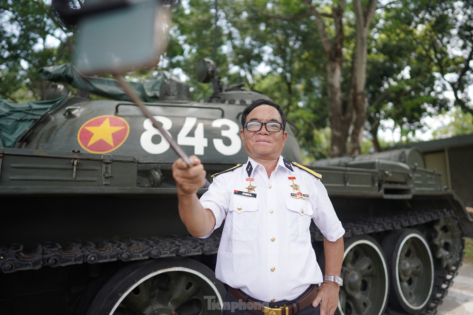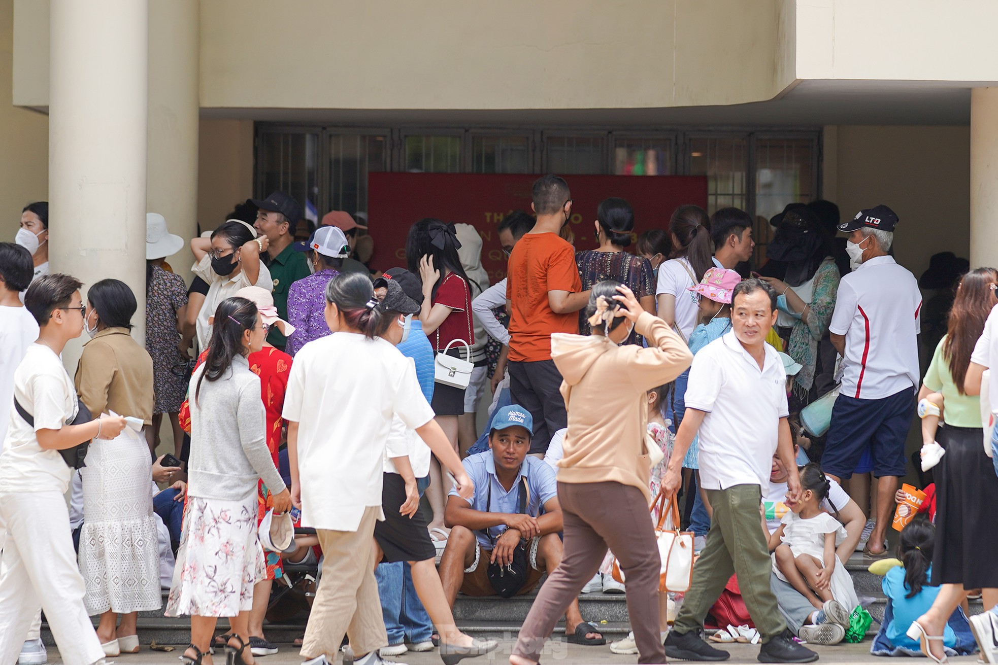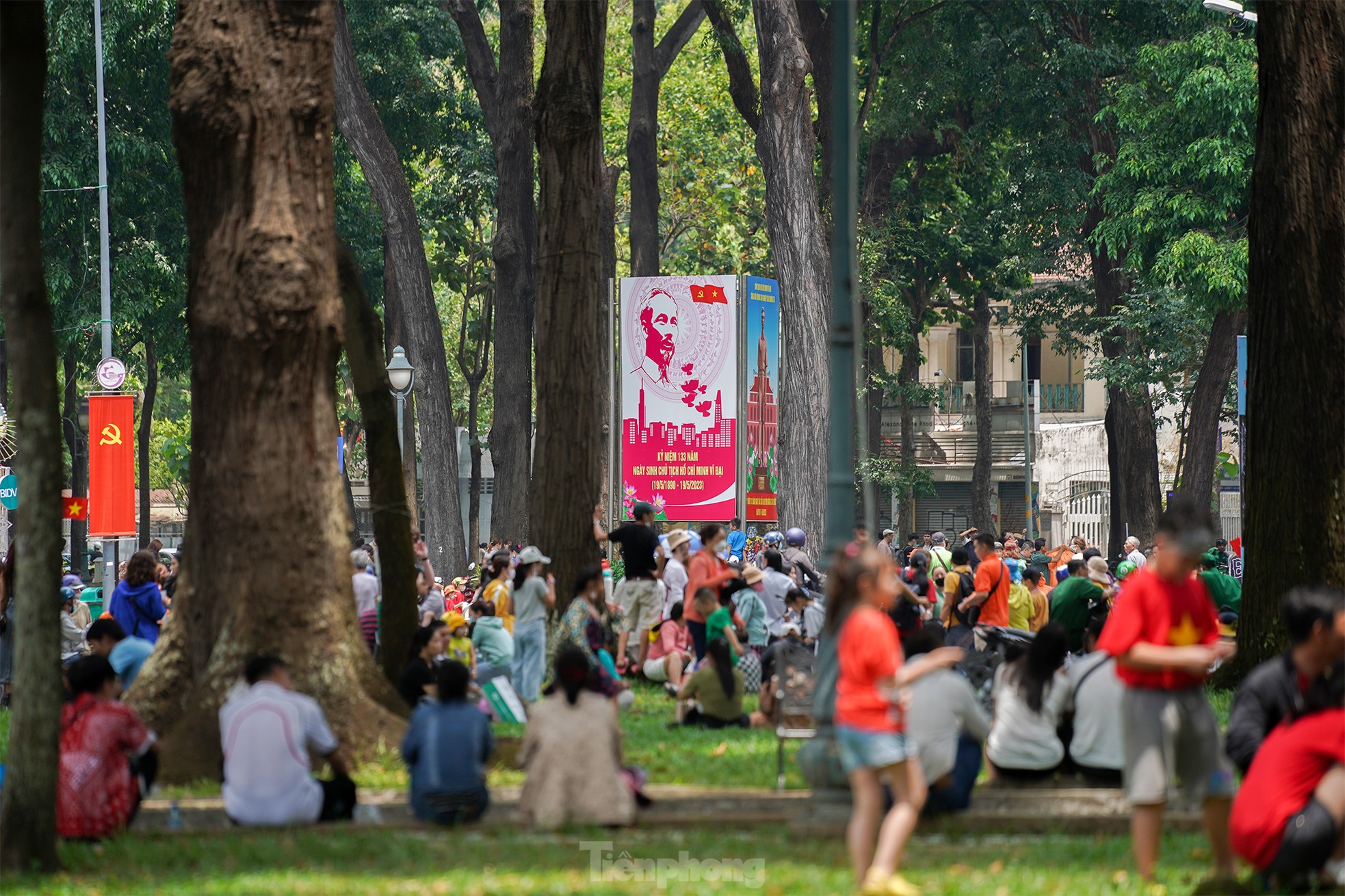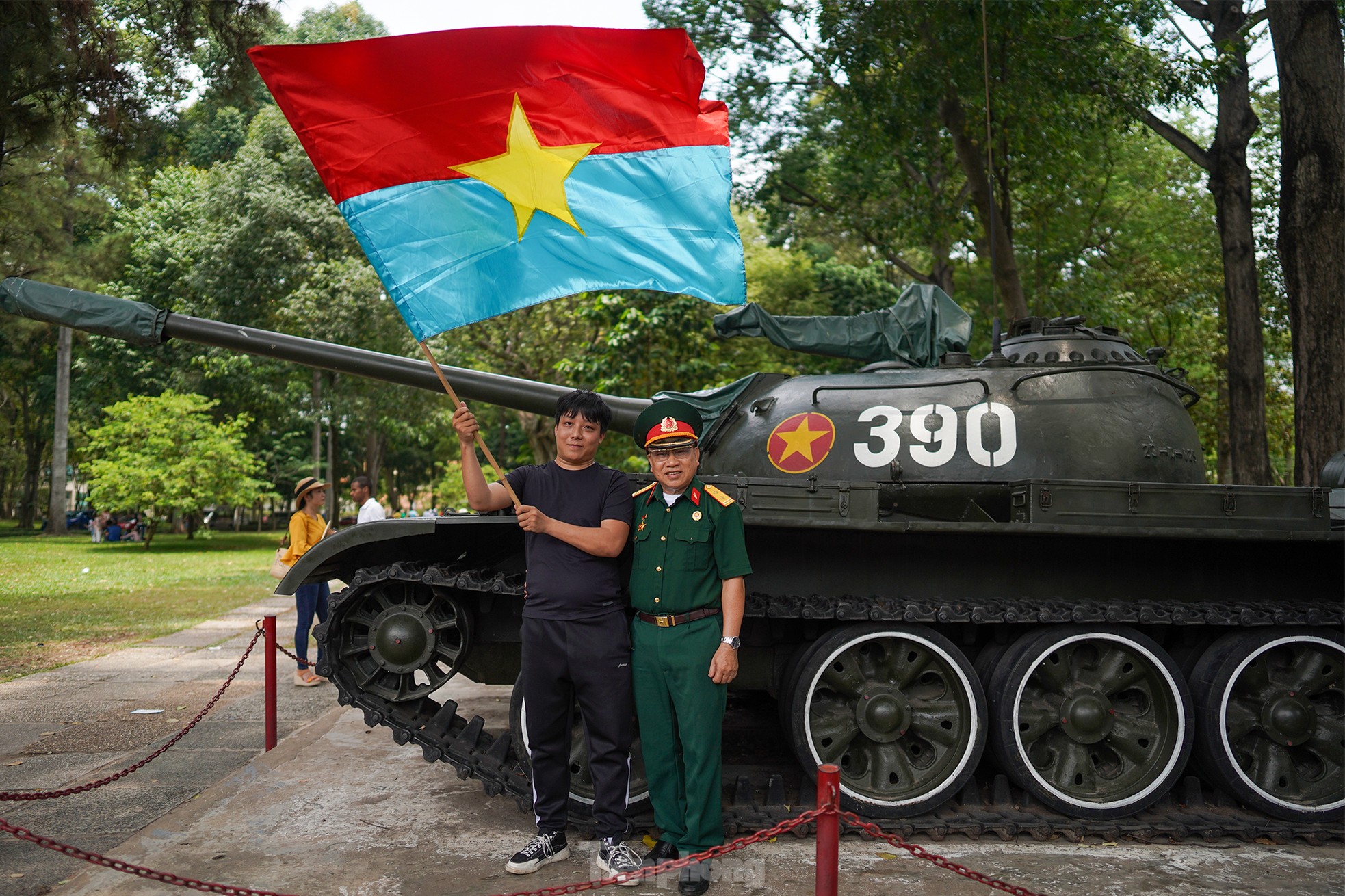 Đến 11h ngày 30/4, nhiều điểm vui chơi giải trí ở hội trường Thống Nhất - di tích Dinh Độc Lập vẫn đông nghịt. Ngoài cổng, du khách xếp hàng dài dưới trời nắng nóng tháng Tư để chờ mua vé vào bên trong.