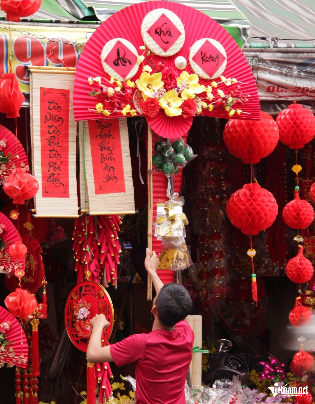 Hai bên con đường dài khoảng 500m được tiểu thương treo, bày bán la liệt những câu đối đỏ, hoa đào, mai giả, phong bì, lồng đèn, lịch, quạt nan,…