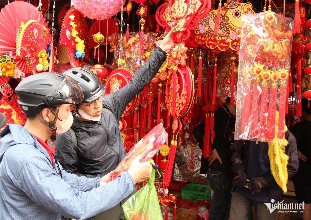 Vì tập trung hàng trăm cửa hàng cùng bán đồ trang trí Tết nên nhiều người gọi vui đây là chợ bán đồ may mắn. Đa số tiểu thương treo, bày đồ trang trí trước cửa tiệm.