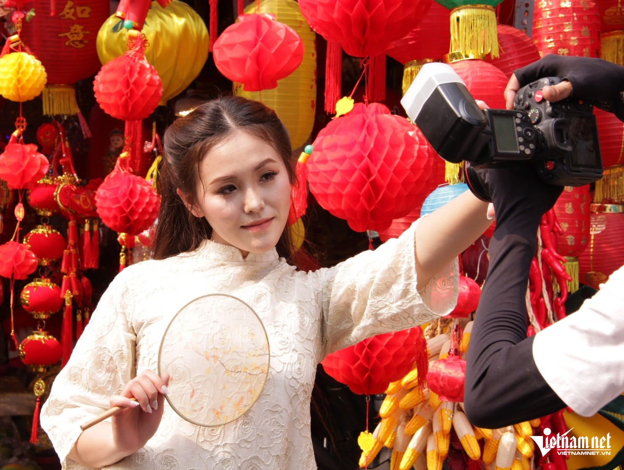 Không chỉ có khách mua hàng, đoạn đường đỏ rực vật phẩm trang trí Tết còn thu hút nhiều người đến tham quan. Đặc biệt, nhiều bạn trẻ xúng xính váy áo đến tạo dáng, chụp ảnh trước những cửa hàng đỏ rực vật phẩm trang trí Tết.