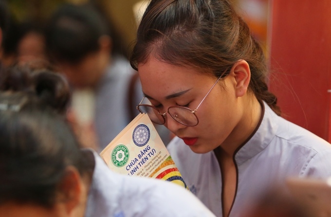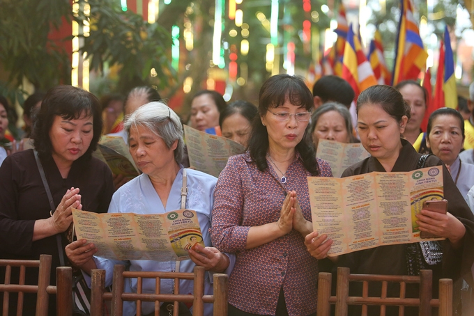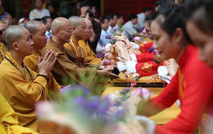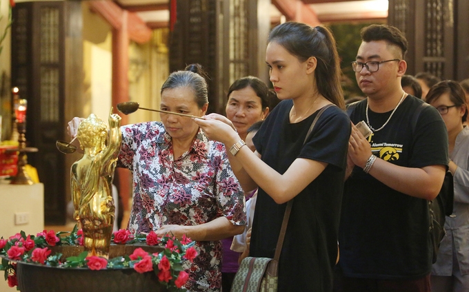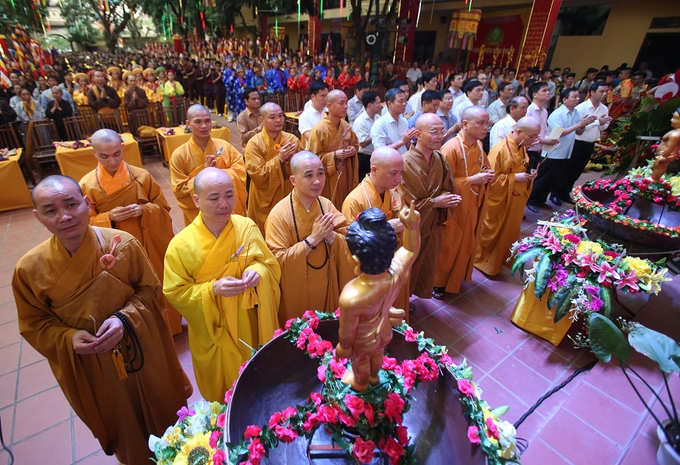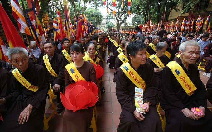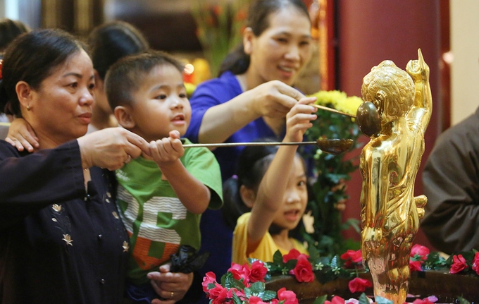 Hàng nghìn tăng ni, phật tử đã tham dự Đại lễ Phật Đản được tổ chức ở chùa Bằng (Hà Nội), trong đó nhiều người xếp hàng để được thực hiện nghi thức tắm Phật.