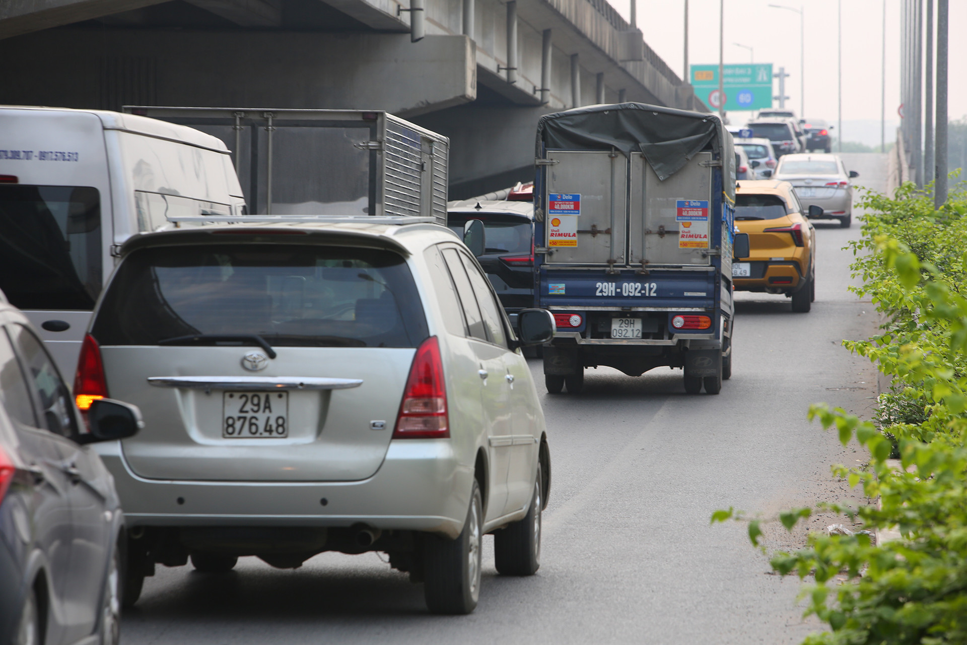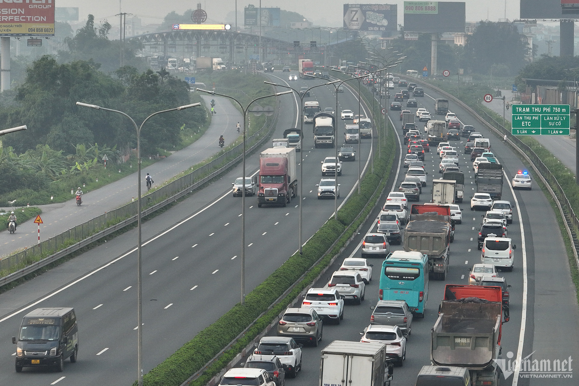 Từ sáng sớm, lượng phương tiện đổ dồn về đường cao tốc Pháp Vân - Cầu Giẽ tăng cao, ùn dài gần 2km chờ qua trạm thu phí này.