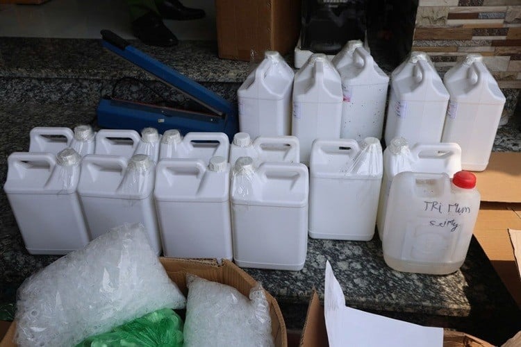 Trong xưởng còn chứa gần 10.000 chai lọ, 300kg nguyên liệu không rõ nguồn gốc như phèn chua, dung dịch pha chế, hương liệu tạo mùi, cùng nhiều máy móc như máy co màng, băng chuyền, máy dập nhãn…