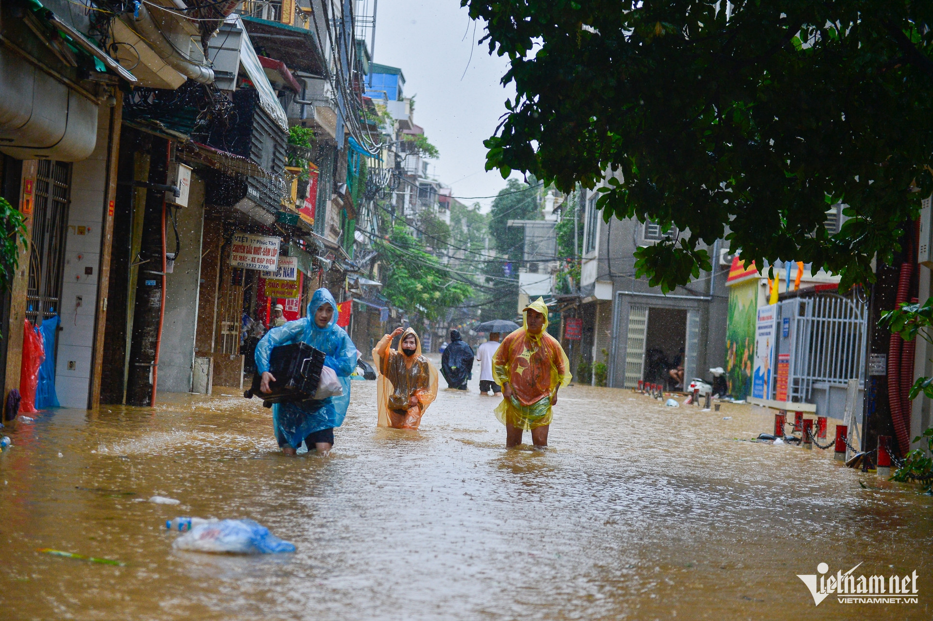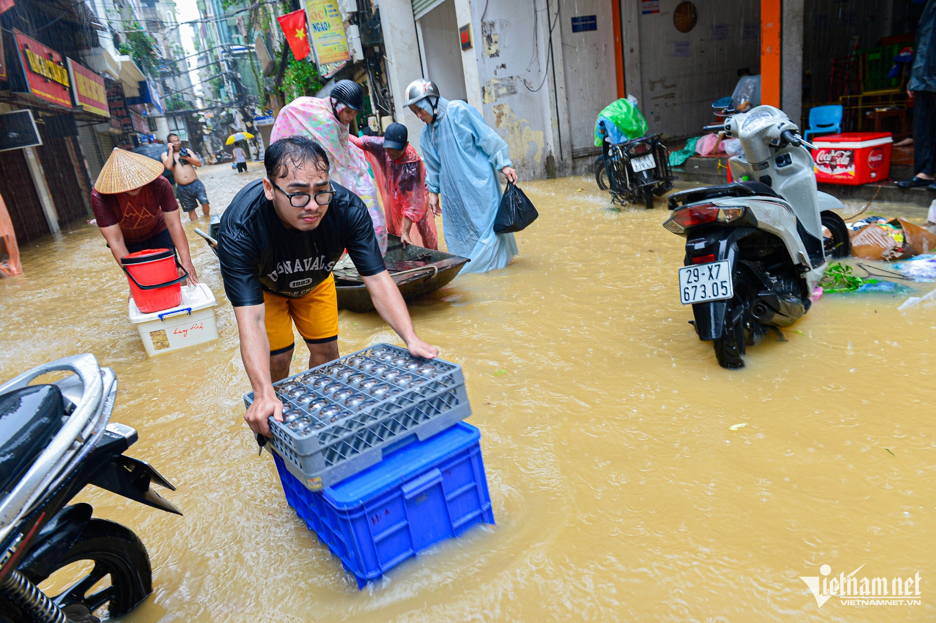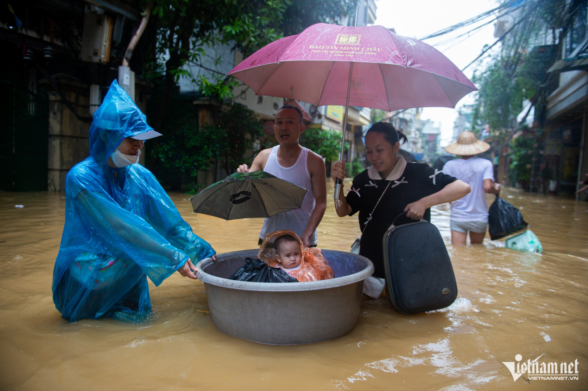 Gia đình chị Hoa phải dùng chậu để đưa con nhỏ ra ngoài đường lớn, về nhà bà ngoại ở quận Hà Đông để tránh ngập. "Nước tràn hết vào nhà rồi, sợ chút nữa nước dâng cao hơn sẽ không thể di chuyển", chị Hoa nói.