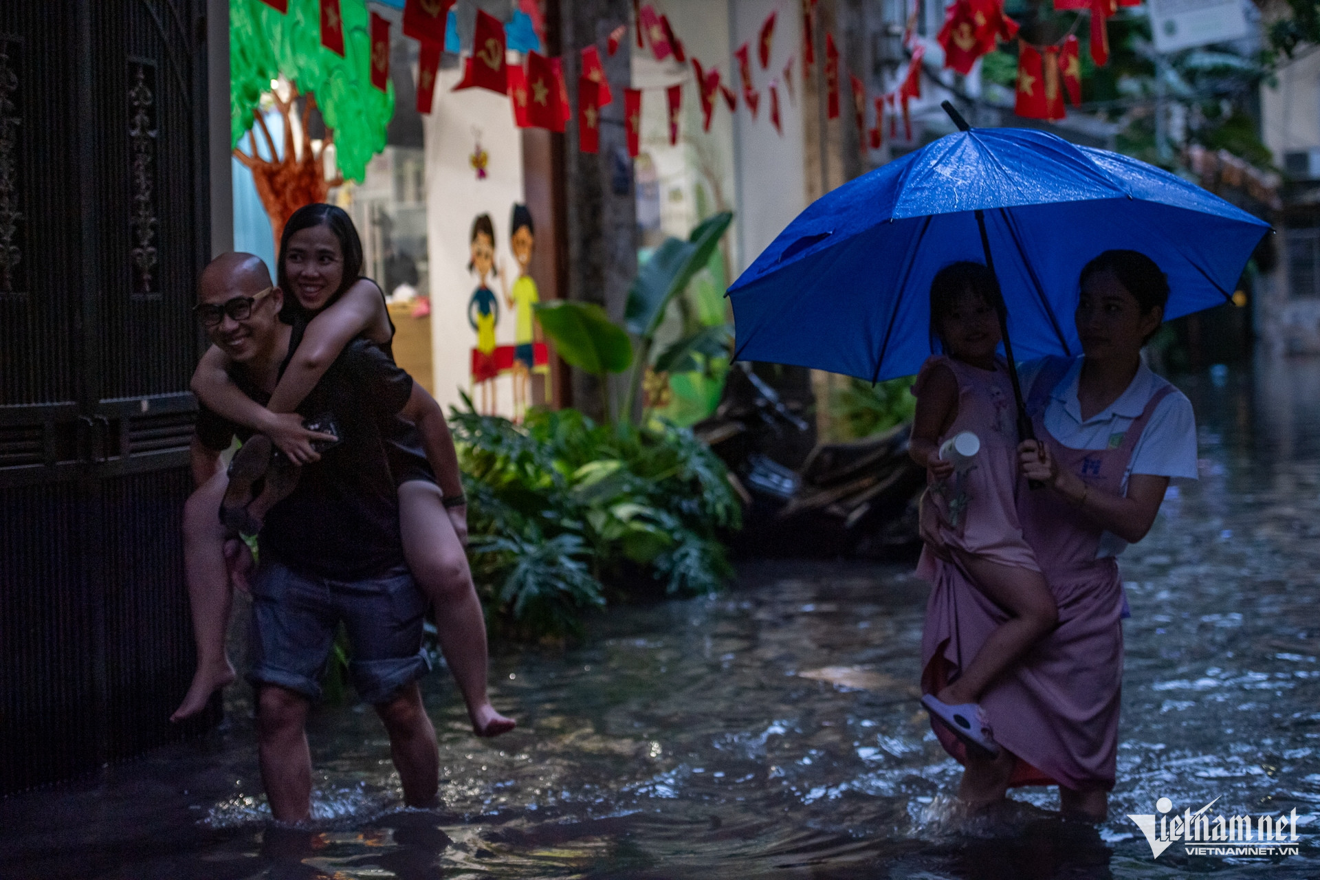 16h30 ngày 30/6, Hà Nội xuất hiện một trận mưa lớn. Bầu trời nhanh chóng tối sầm, nhiều khu dân cư rơi vào cảnh ngập nặng. Tại ngõ 42 Giang Văn Minh, cảnh người dân trở về nhà phải cõng nhau diễn ra phổ biến.