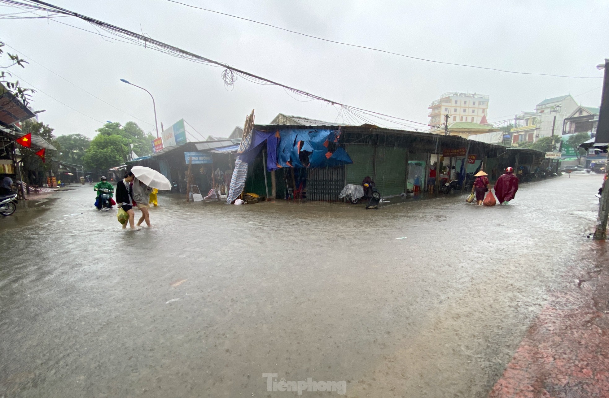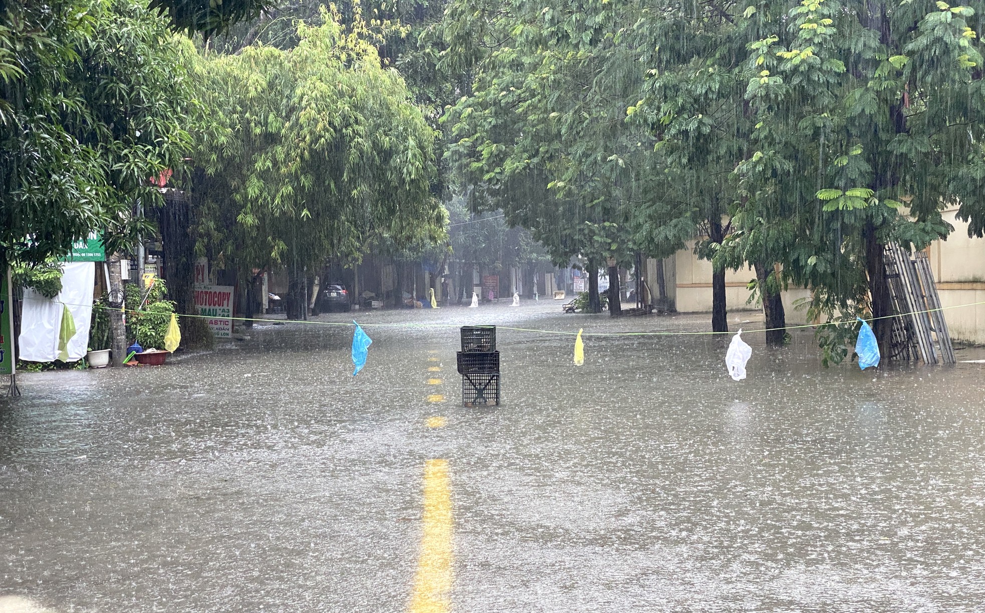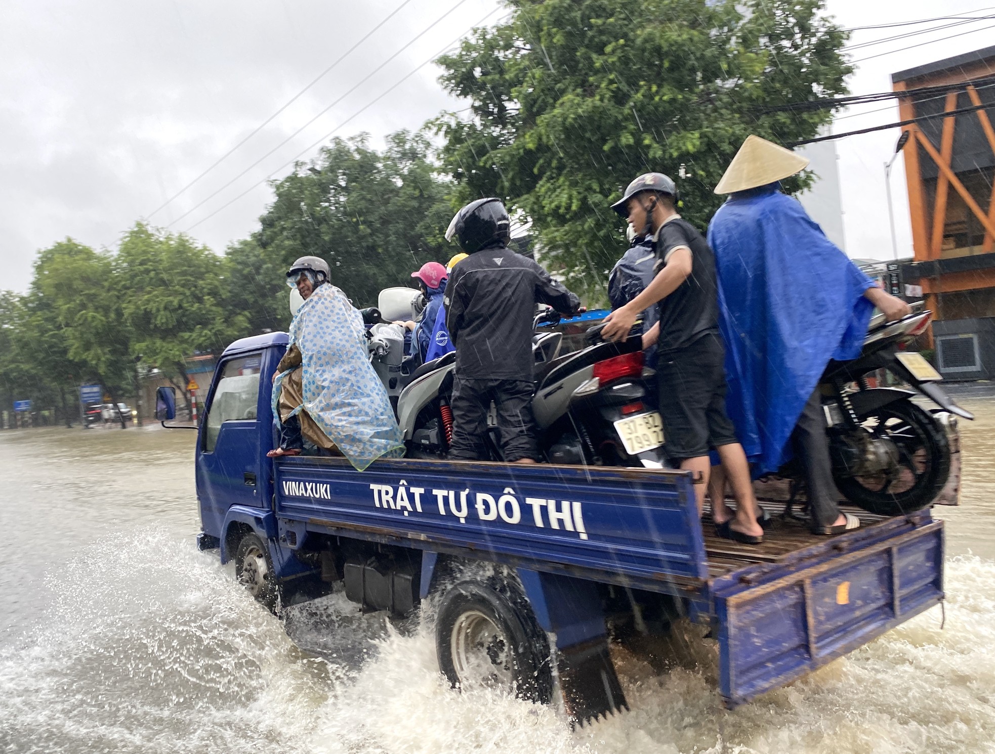 23/09/2024 21:07Đường ngập sâu, dân bì bõm mang thùng xốp làm thuyền kéo đồ trên phố