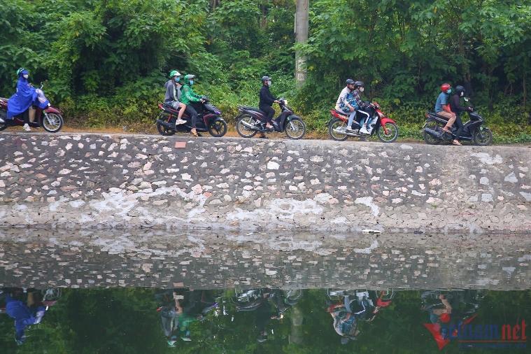 Ô tô, xe máy đi theo hướng Quốc lộ 1A hướng vào thành phố bị ùn tắc kéo dài. Nhiều người dân đã đi vào các đường mòn của kênh thoát nước Yên Sở để thoát tắc.