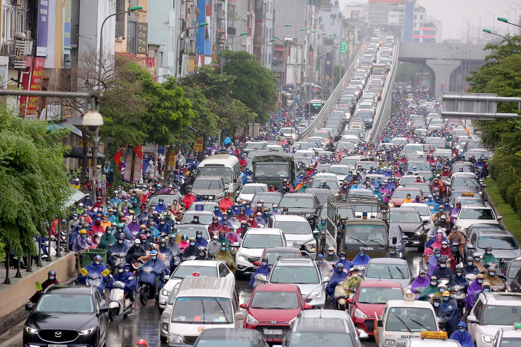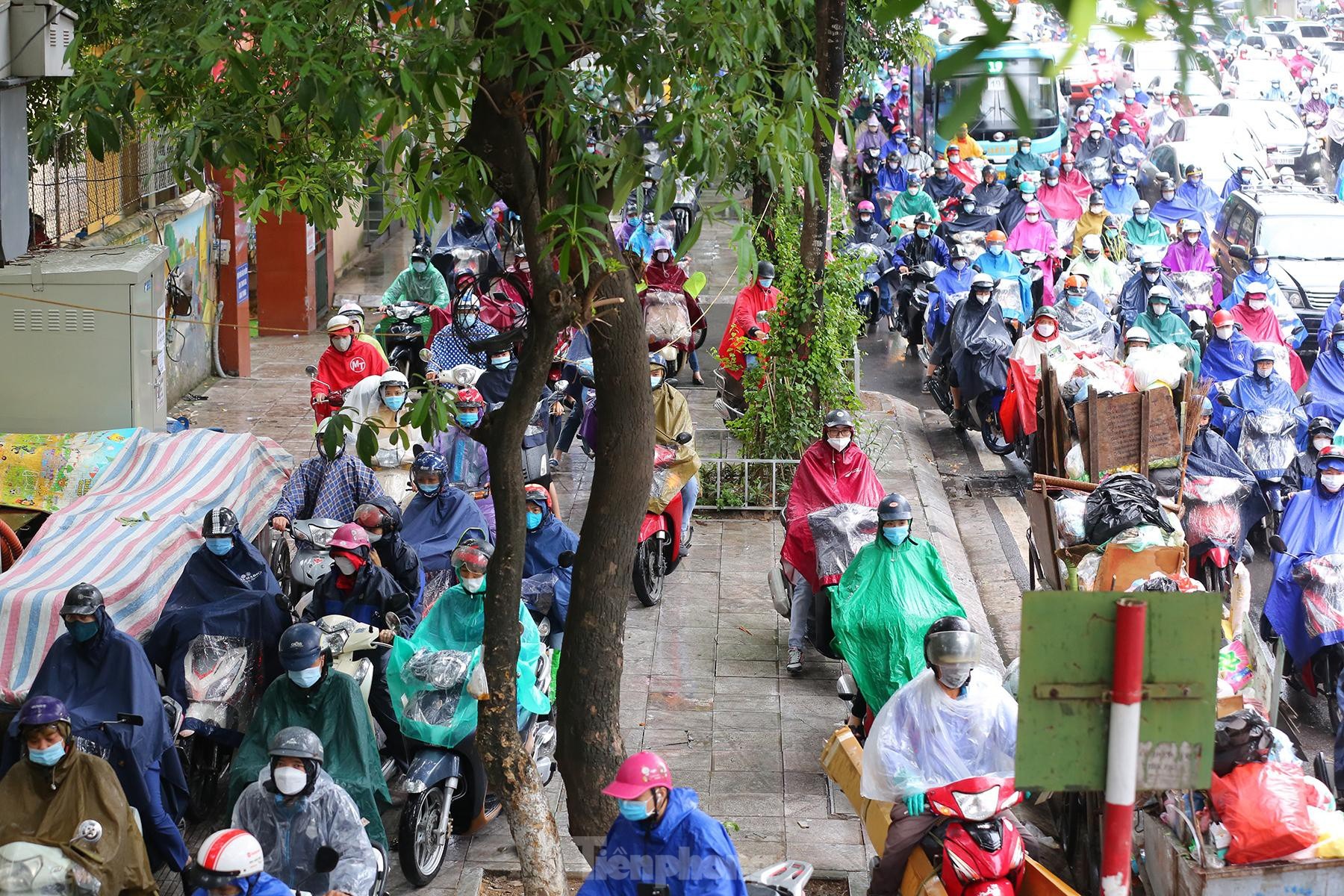Nhiều người "chôn chân" hàng giờ trong mưa lạnh. Tại khu vực đường dẫn lên cầu vượt Ngã Tư Sở, tình trạng ùn tắc diễn ra nghiêm trọng hơn. Các phương tiện xếp hàng dài, ôtô và xe máy đan xen nhau chật cứng.