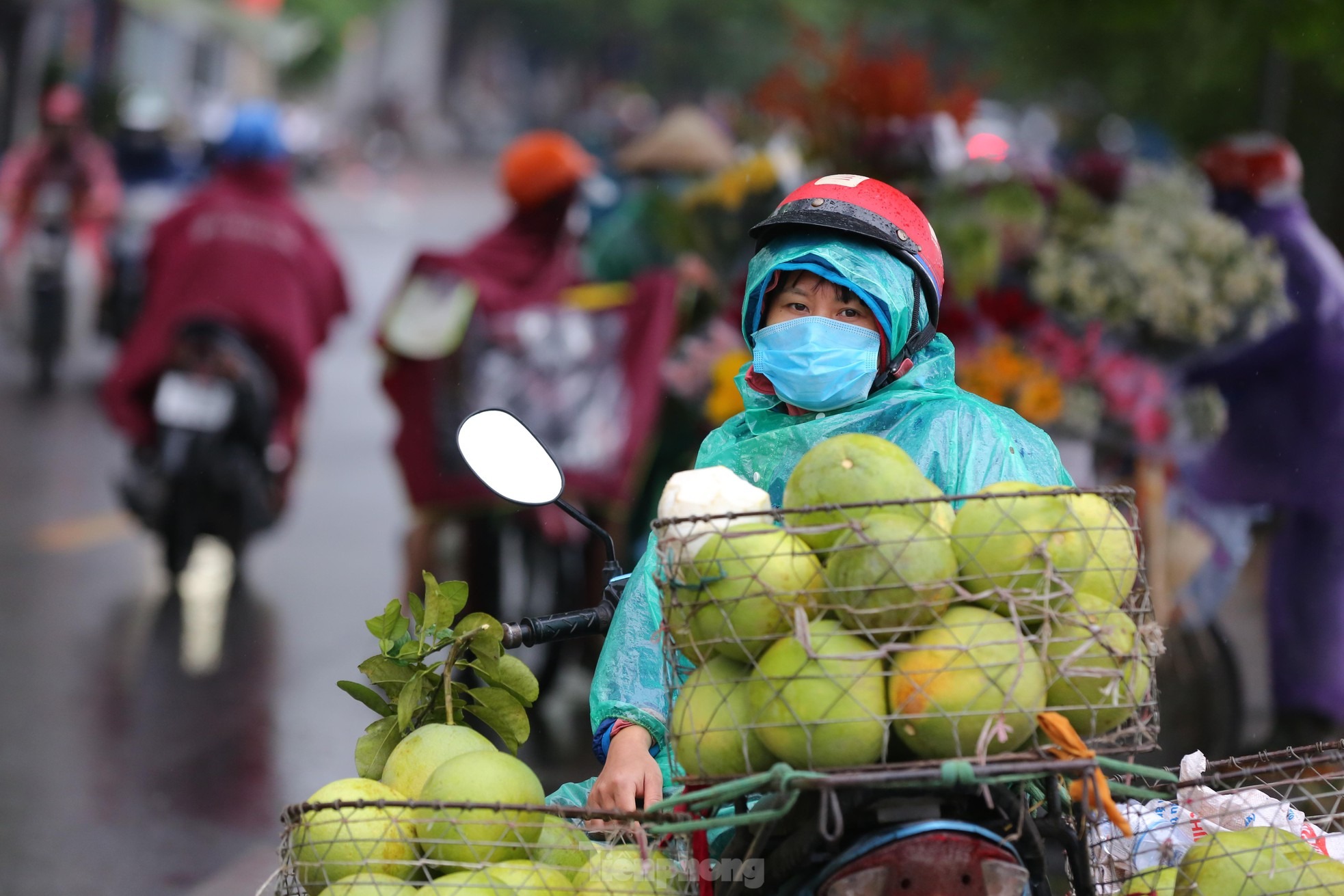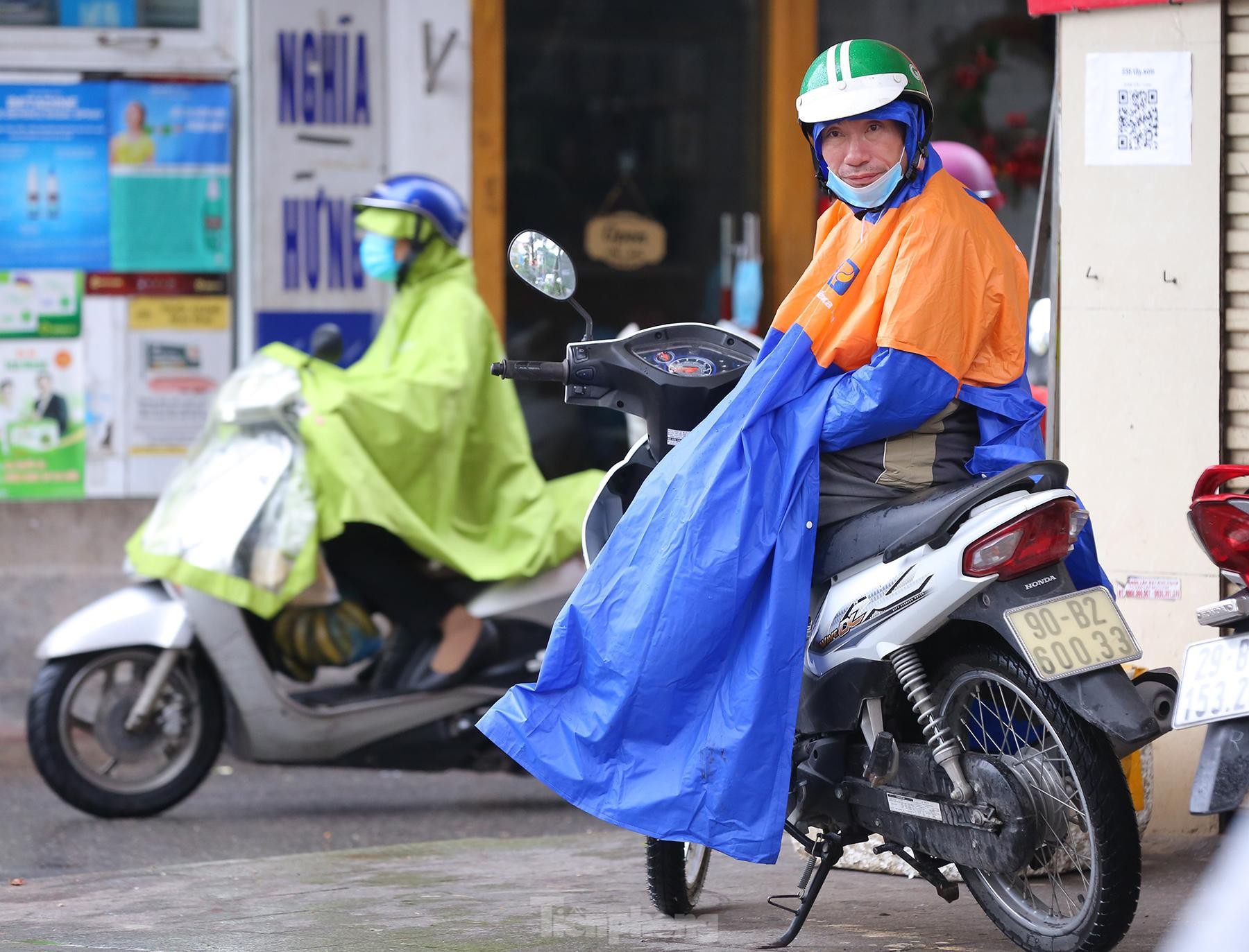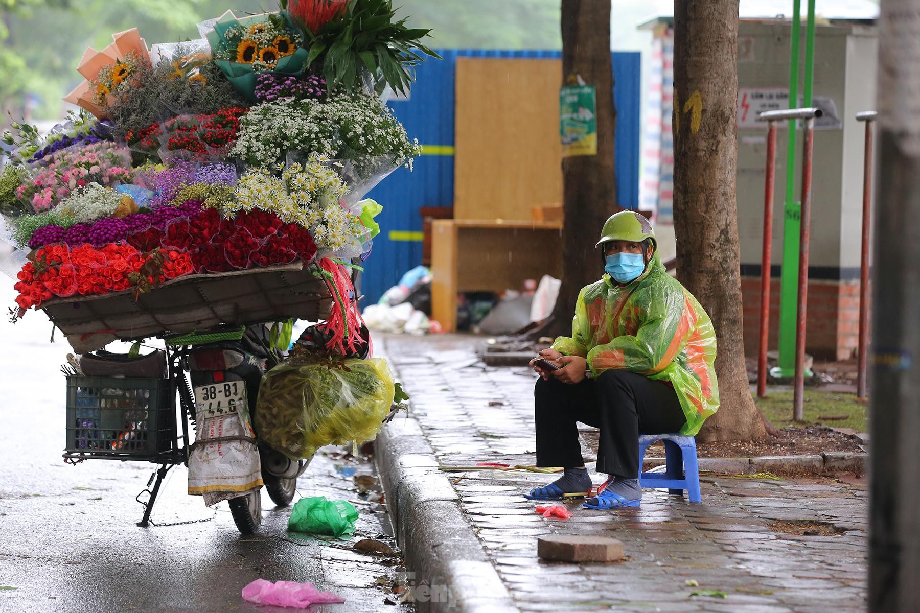 Người bán hàng rong ngồi thẫn thờ đợi khách trong tiết trời mưa lạnh.