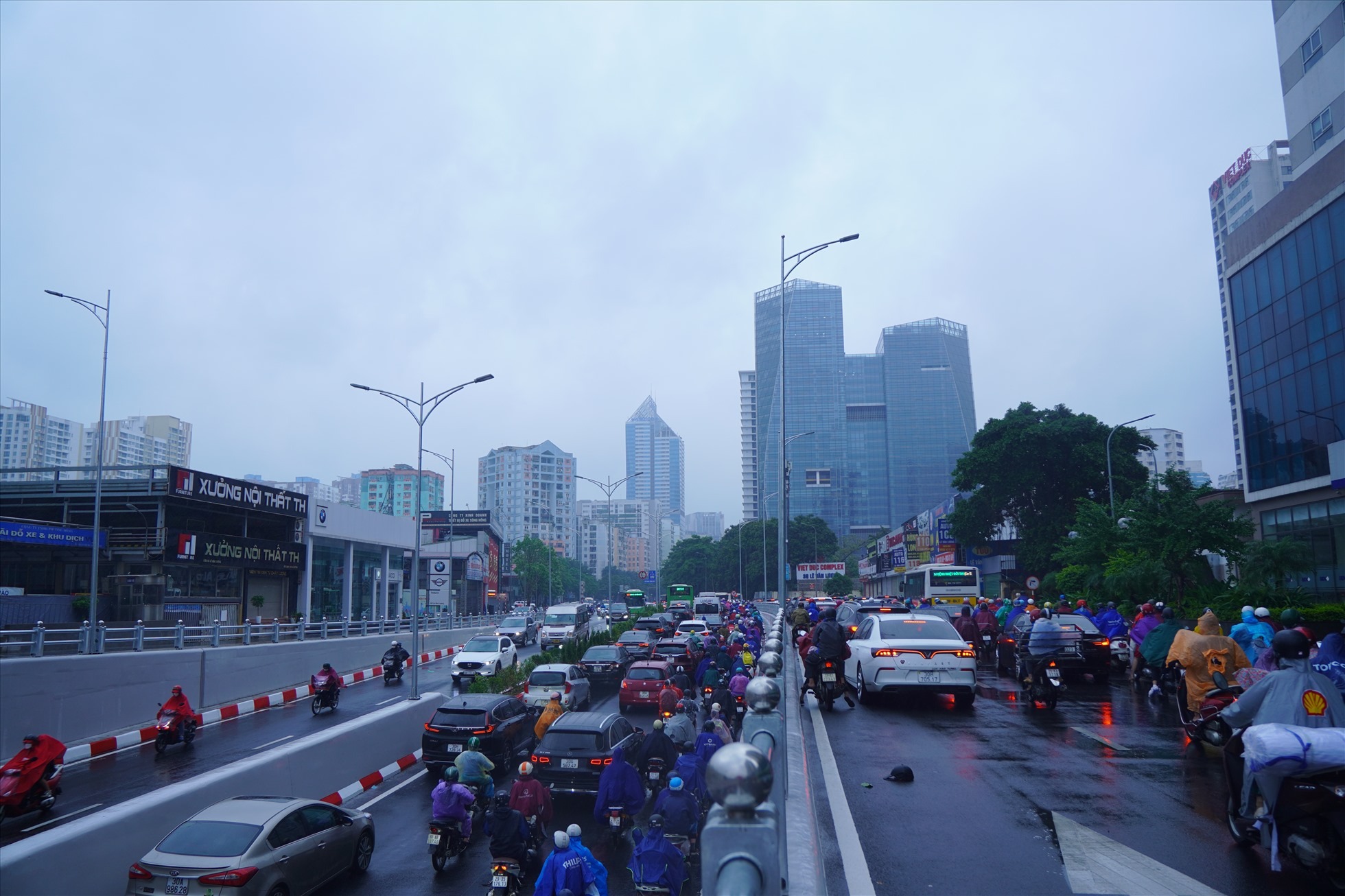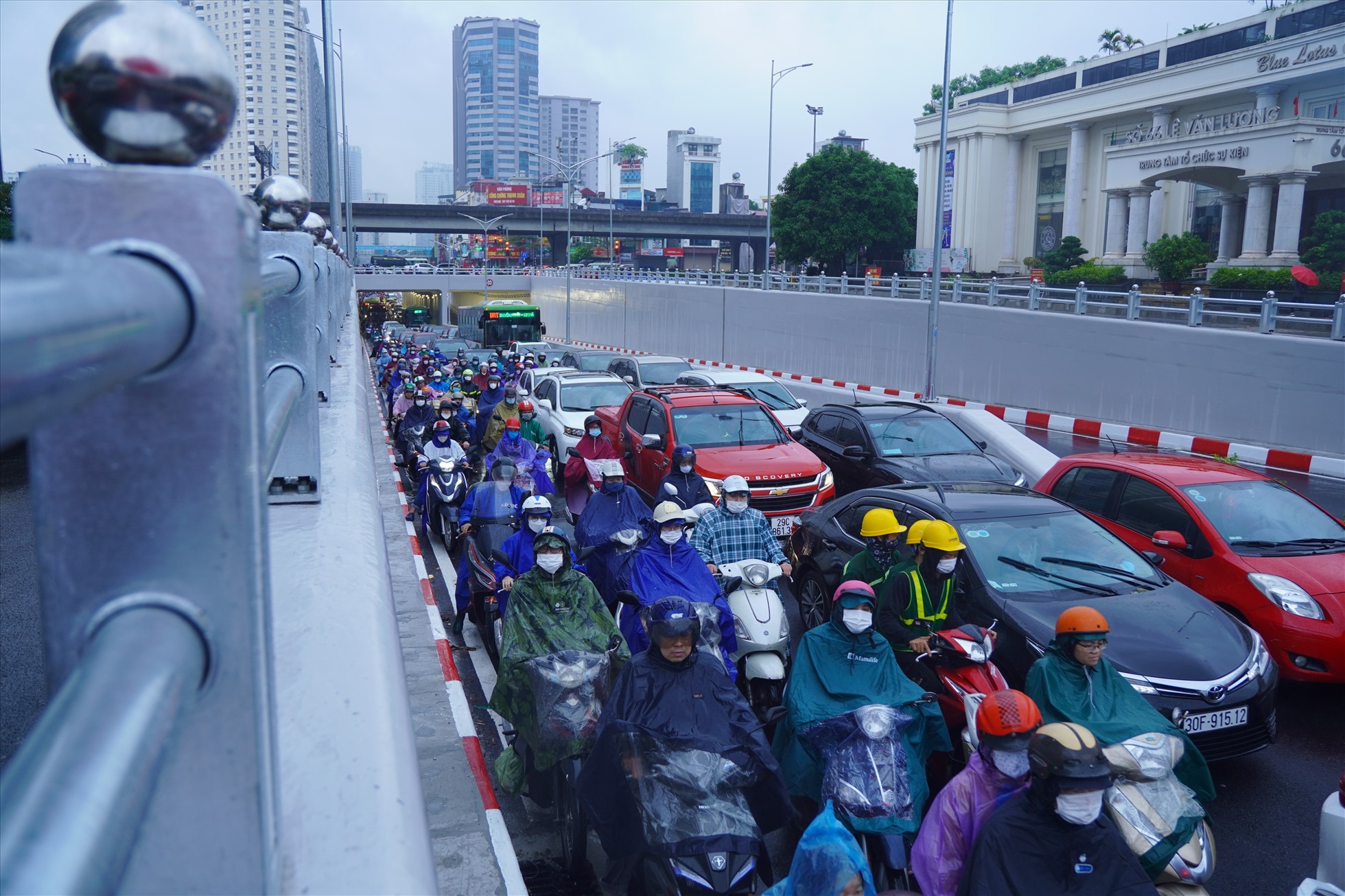Trên tuyến đường Tố Hữu (hướng Lê Văn Lương), lượng ôtô, xe máy dưới hầm chui xếp thành hàng dài, nhích từng mét để đến nút giao Lê Văn Lương - Hoàng Minh Giám. Tại đường phía trên miệng hầm, ôtô và xe máy cũng ken đặc.