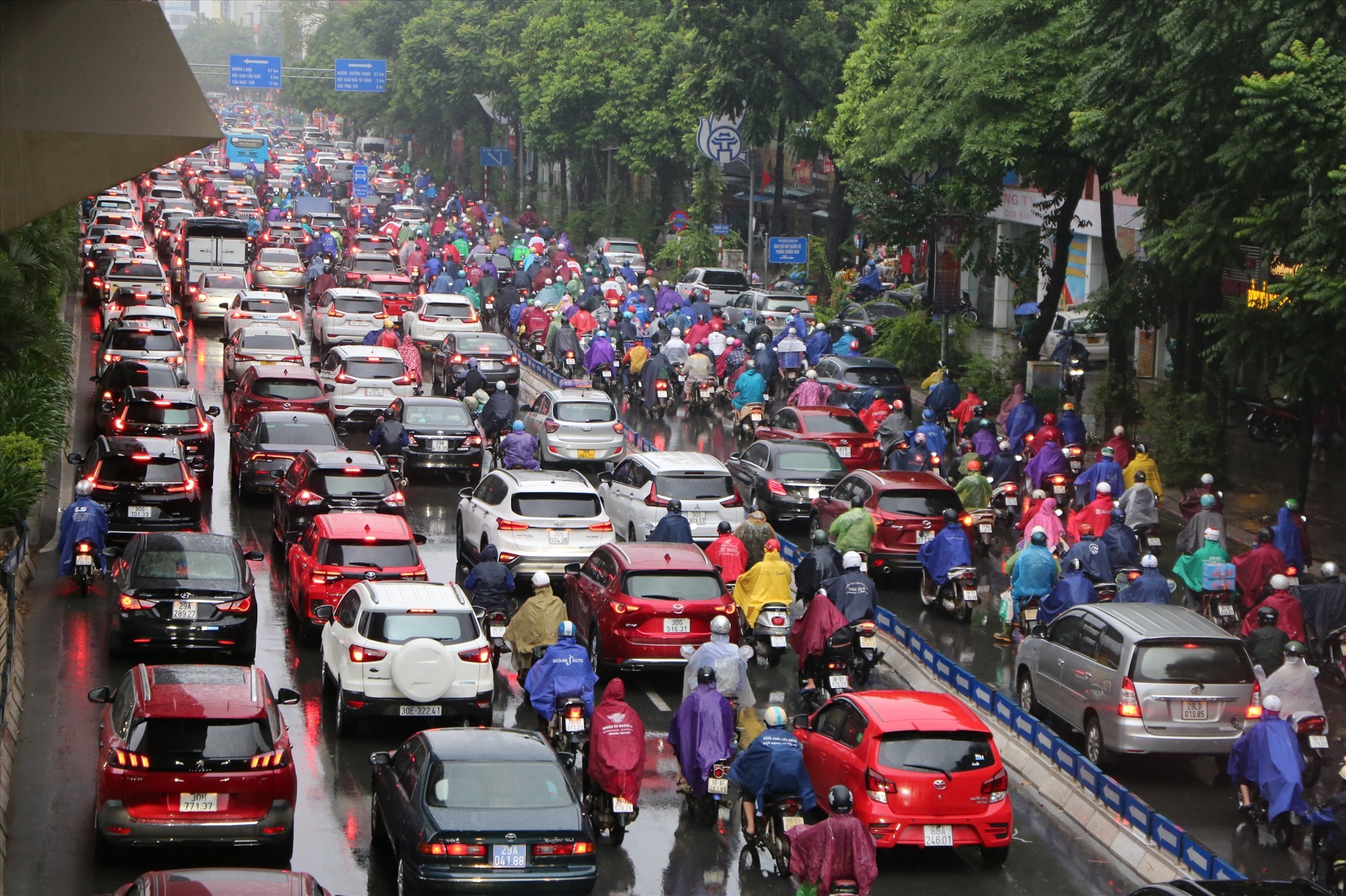 Tình trạng ùn tắc kéo dài từ nút giao Nguyễn Trãi – Khuất Duy Tiến đến Ngã Tư Sở, lực lượng CSGT làm nhiệm vụ tại đây phải rất vất để phân luồng. Nhiều người đã đi lên vỉa hè hoặc đi ngược chiều để tìm đường, thoát ùn tắc.