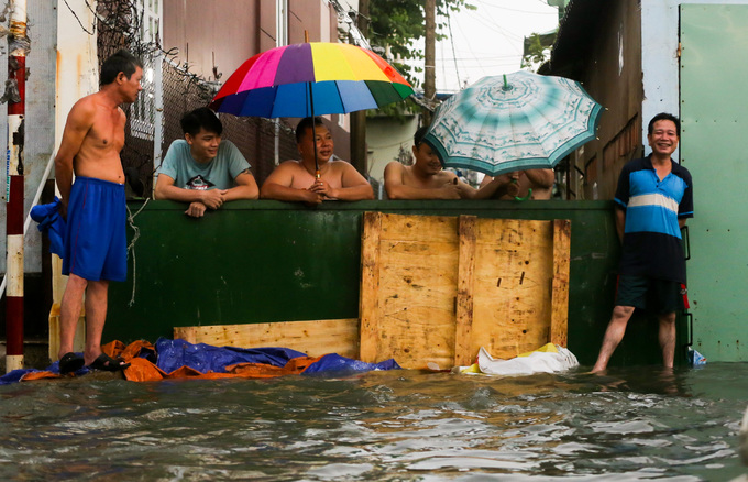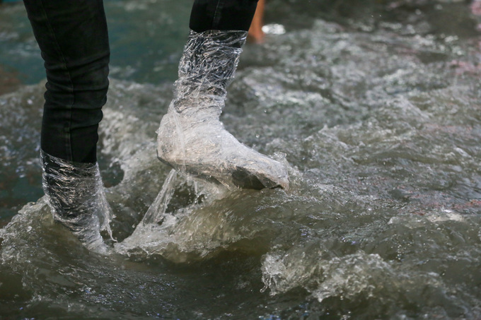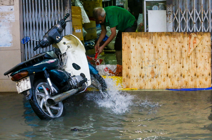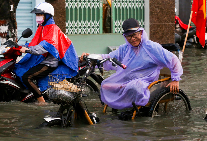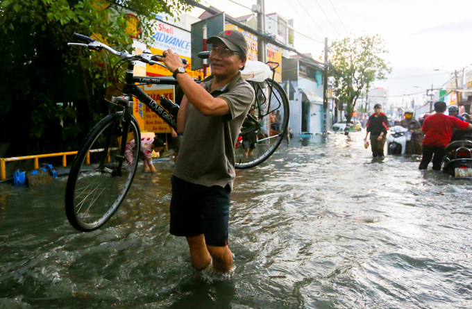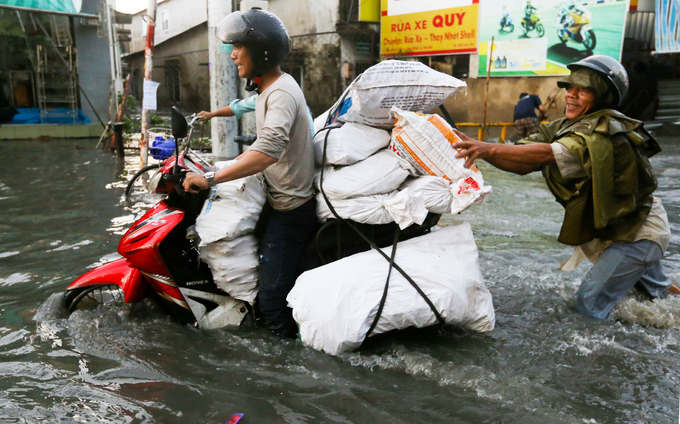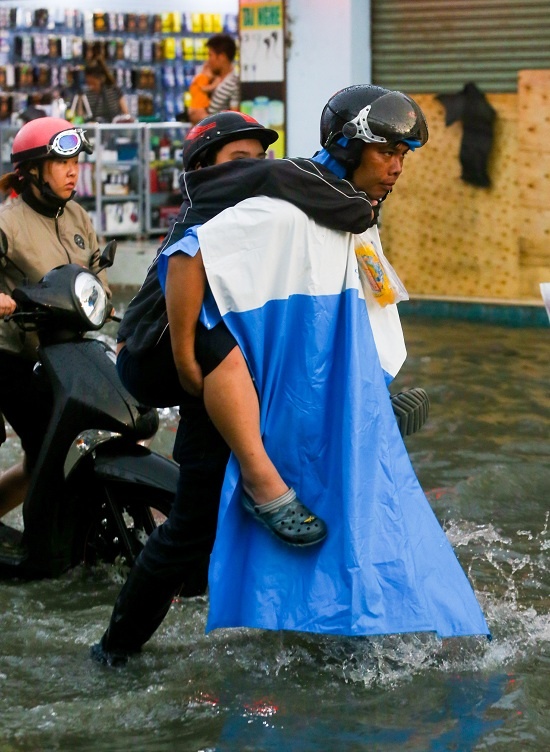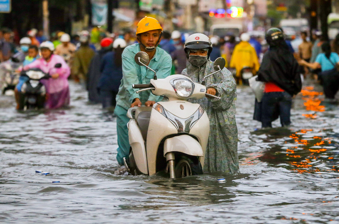 Cơn mưa dai dẳng trong giờ tan tầm khiến tuyến đường ở quận Thủ Đức ngập sâu quá bánh xe máy, người dân vất vả lội nước về nhà.