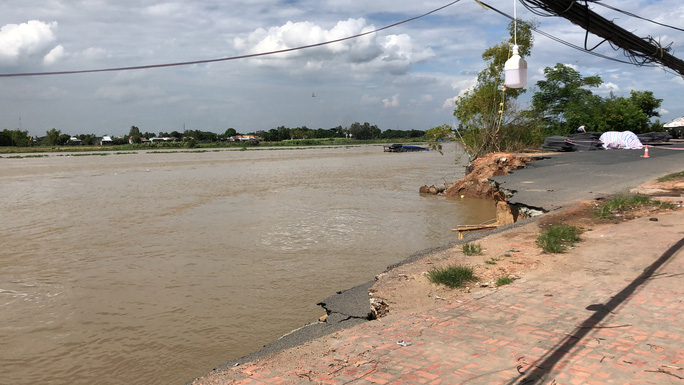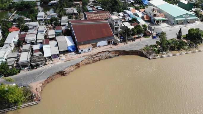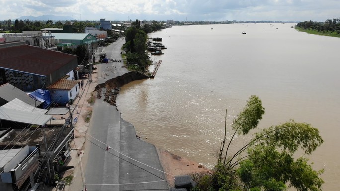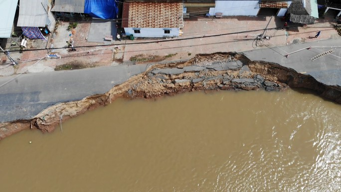 Từ hệ thống flycam cho thấy mặt đường đã rơi hoàn toàn xuống dòng nước sông Hậu, ăn sâu hơn 4m và sát nhà dân.