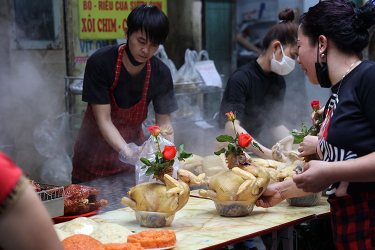 Sáng 29 Tết, chợ Hàng Bè, phố Gia Ngư tại Hà Nội đã ùn tắc từ sớm, các cửa hàng bán gà ngậm hoa hồng để cúng khá đắt hàng và có nhiều lúc người mua phải tranh nhau để nhận hàng đã đặt trước.