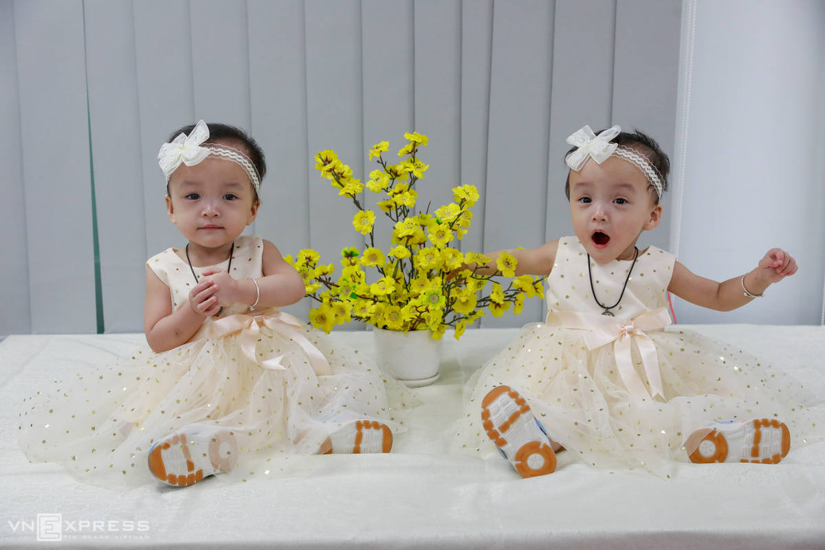 Trong ảnh, Diệu Nhi (tên thân mật là Táo đỏ) ngồi gọn trong lòng ba, còn chị Trúc Nhi (Dâu tây) tinh nghịch đứng lên nhún nhảy, đòi bước đi. Gần ba tháng trước, khi ấy mới hai tháng sau mổ tách, các con mới lần đầu tiên tập đứng bằng khung kim loại. Nay đã có thể tự đứng vững, bước đi chập chững một đoạn ngắn.