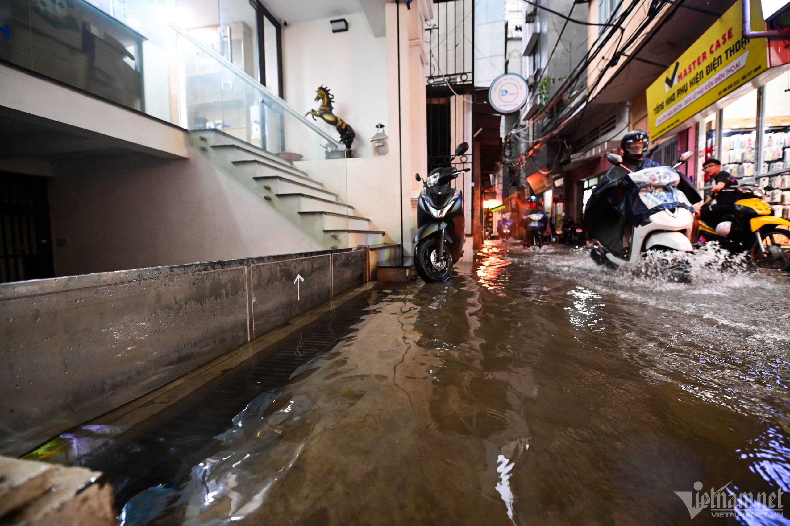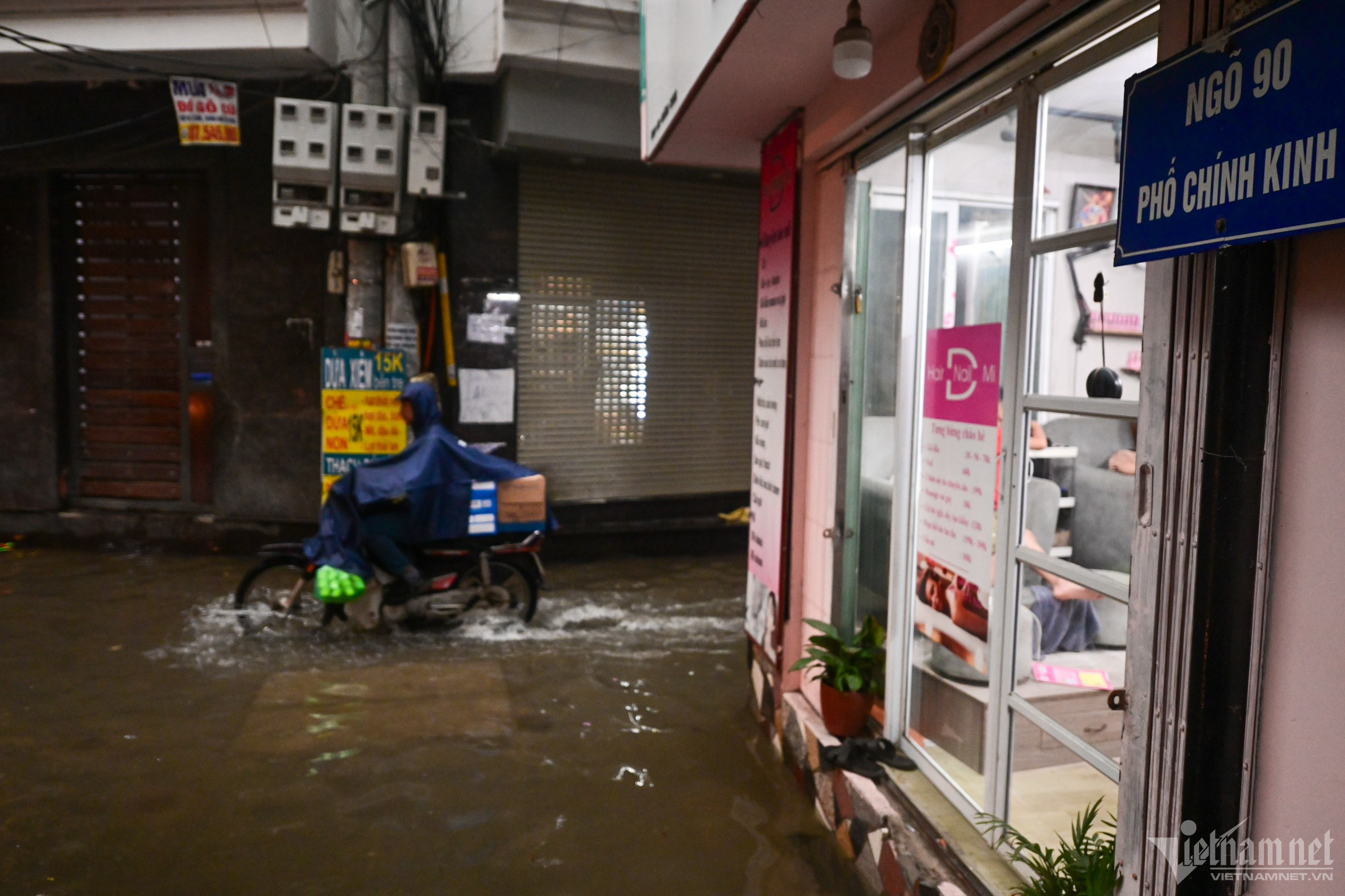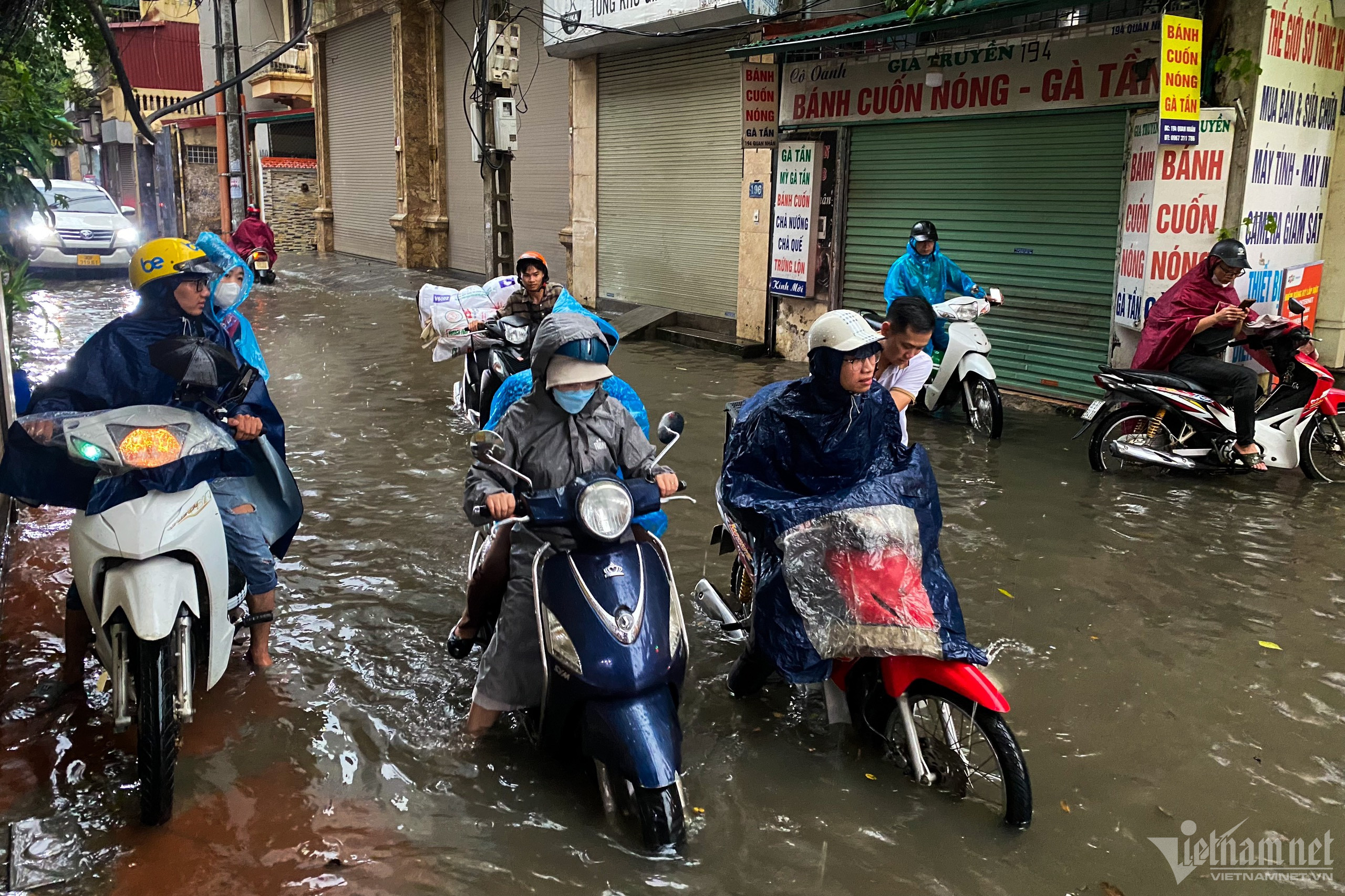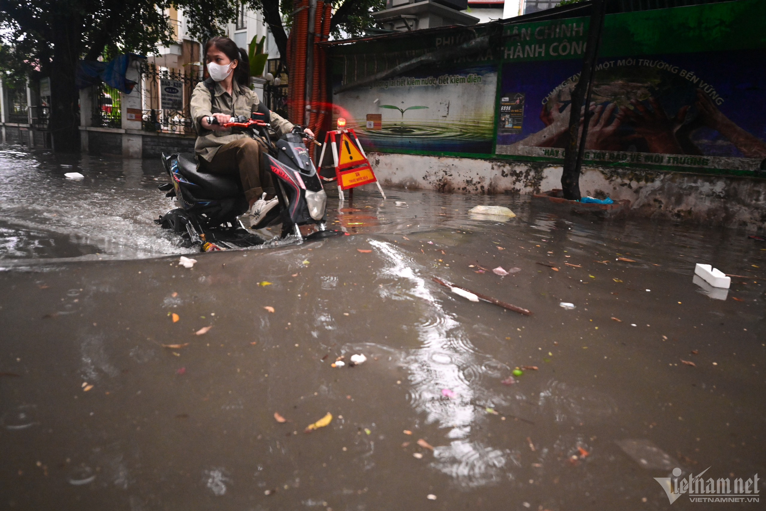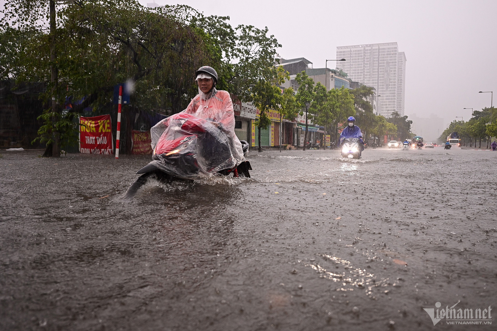 Trận mưa tuy chỉ kéo dài chưa đầy 30 phút nhưng đủ làm nhiều tuyến đường trung tâm thủ đô bị ngập sâu. Nhiều người đi xe máy bị bất ngờ, chới với giữa dòng nước.
