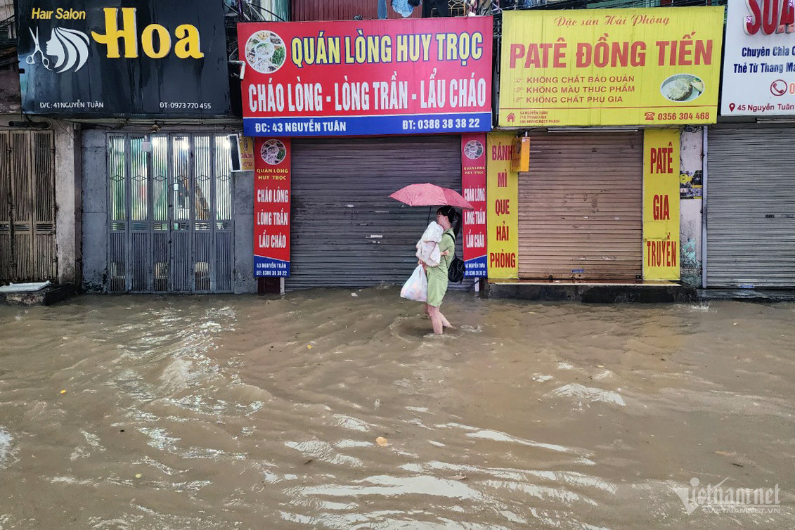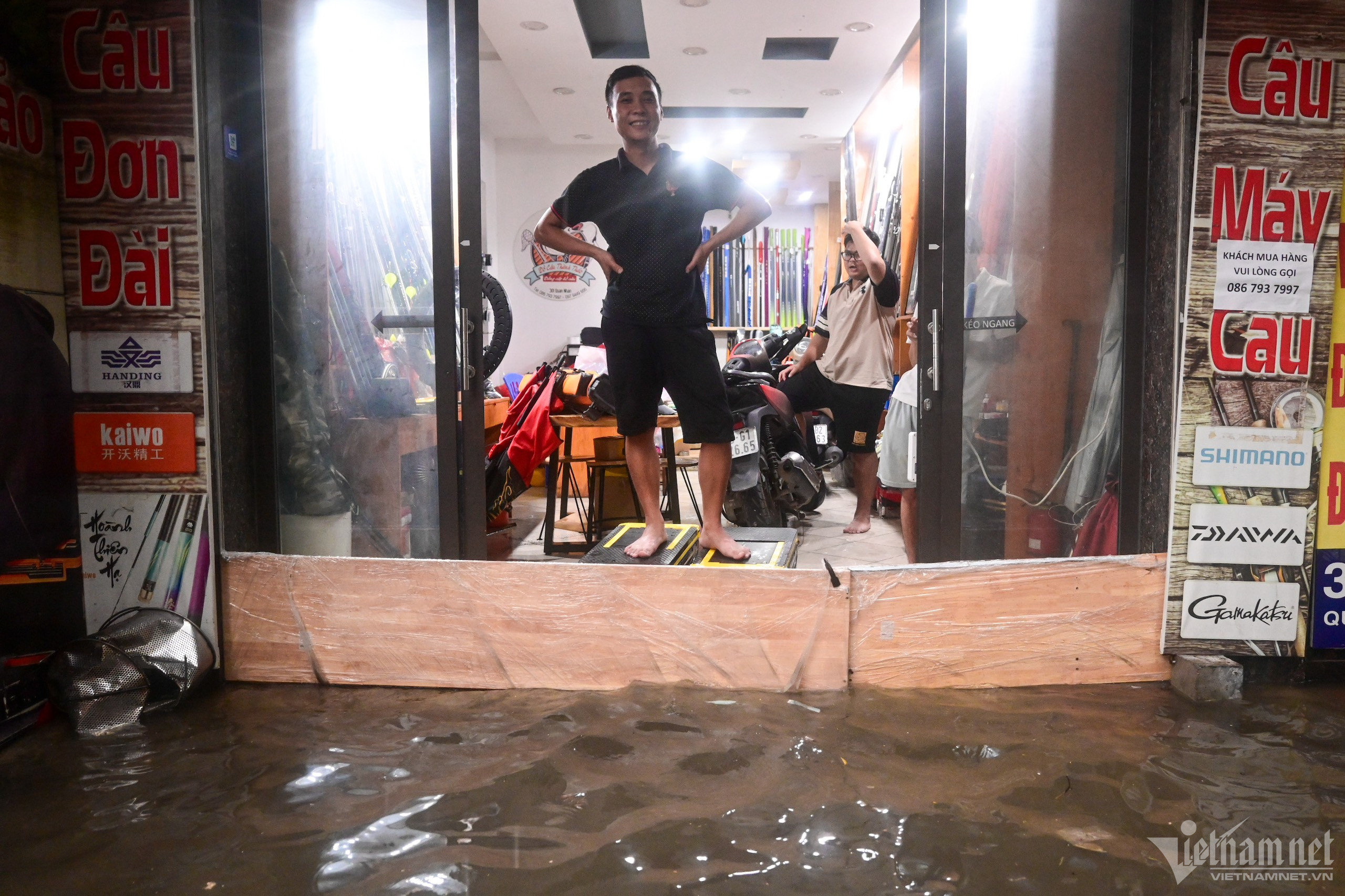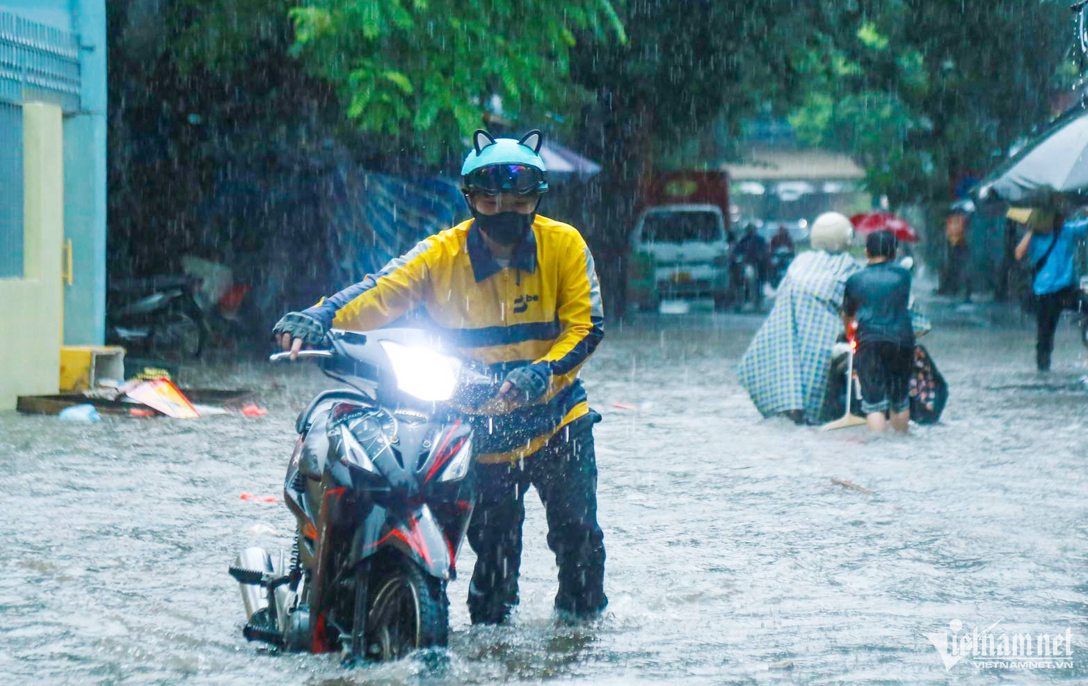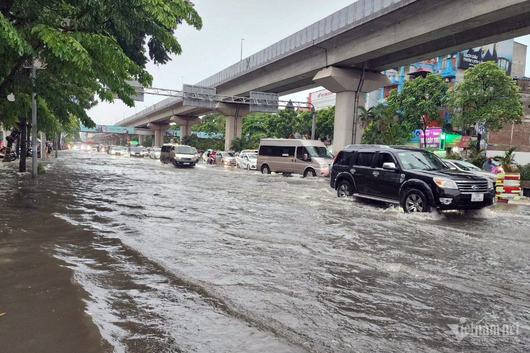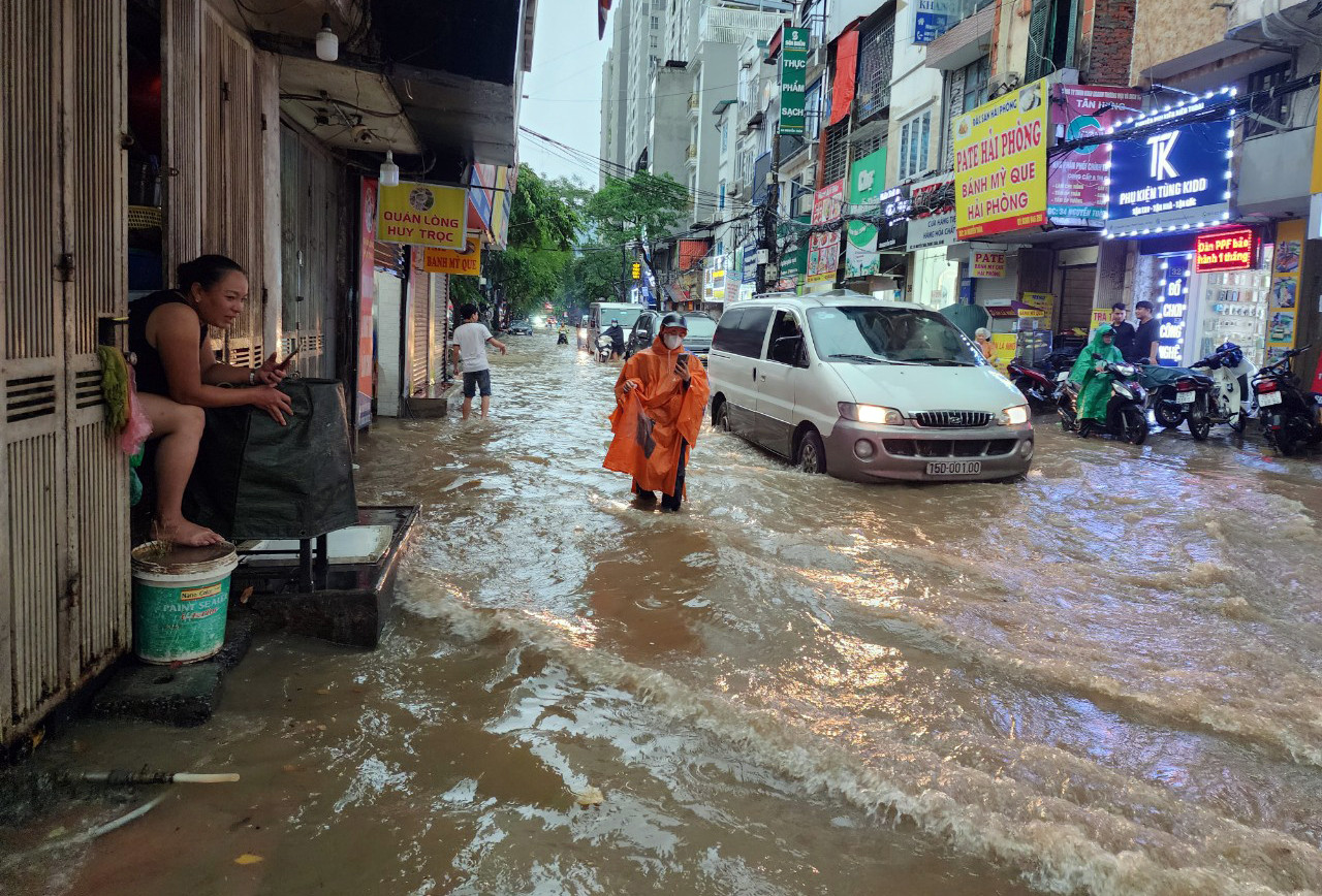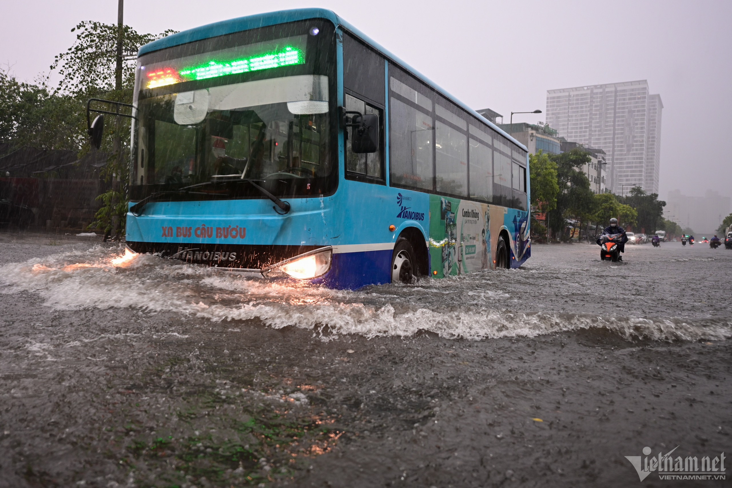 Trận mưa tuy chỉ kéo dài chưa đầy 30 phút nhưng đủ làm nhiều tuyến đường trung tâm thủ đô bị ngập sâu. Nhiều người đi xe máy bị bất ngờ, chới với giữa dòng nước.