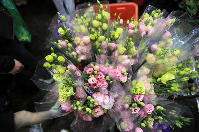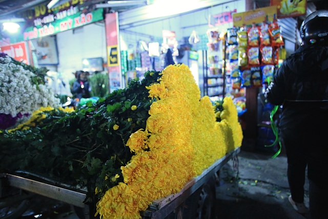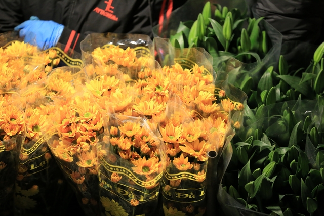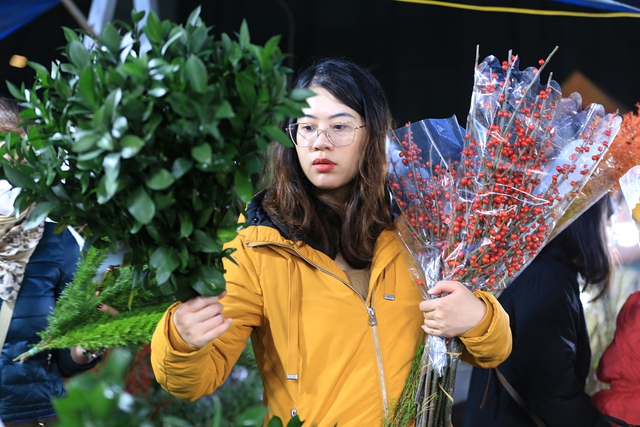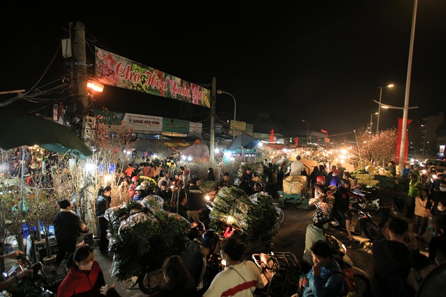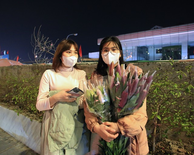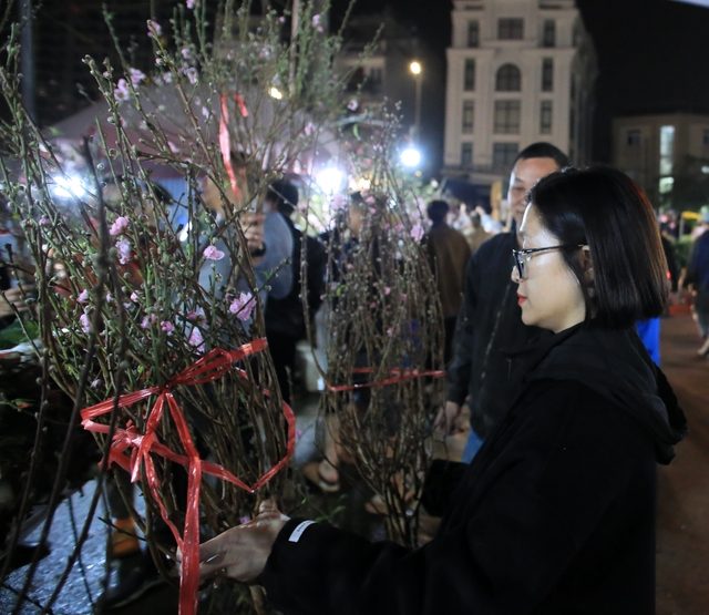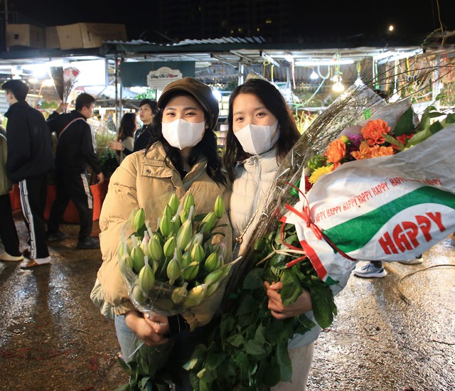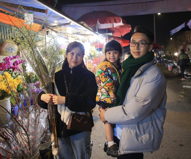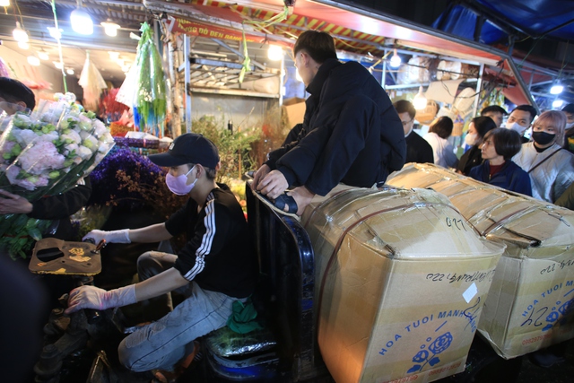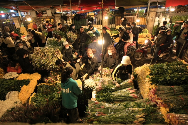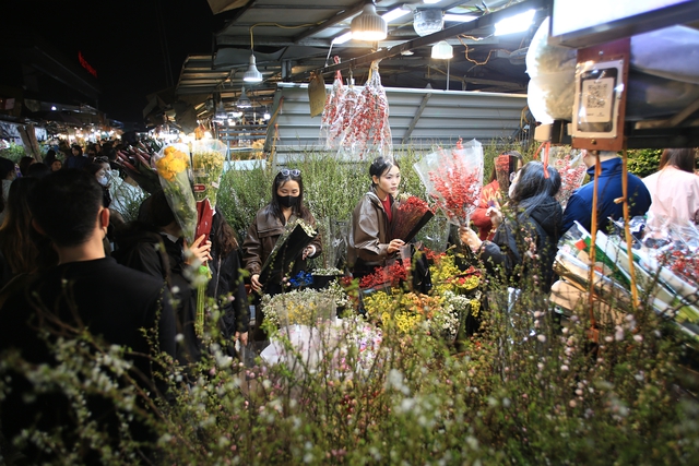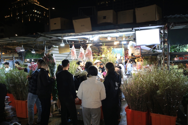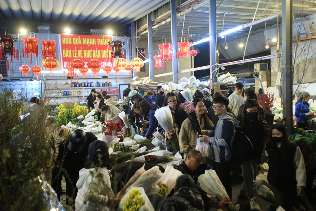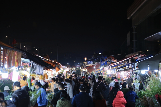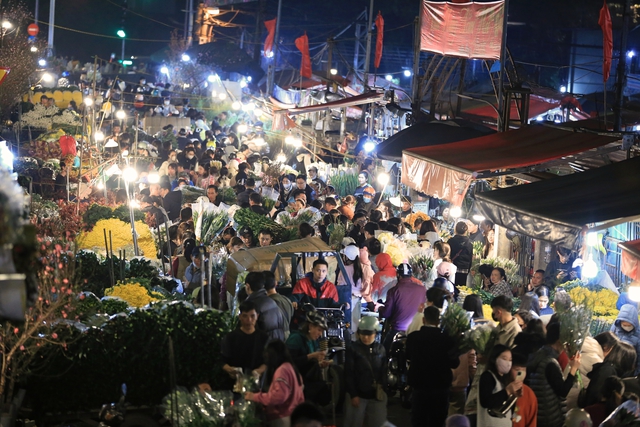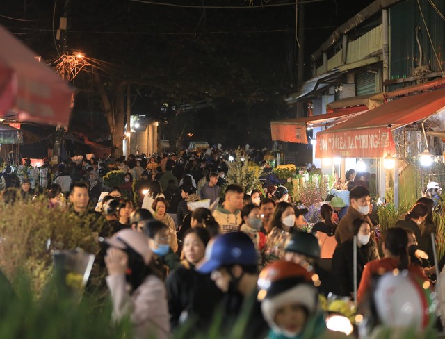Chợ hoa Quảng An những ngày cận Tết đông nghịt người, từng dòng người chen chân trong đêm để mua sắm, tạo nên không khí tấp nập.