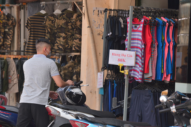 Khác hẳn với sự vắng vẻ, đìu hìu của những ngày trước đây, tuyến phố Hàng Ngang - Hàng Đào đông đúc, người ra vào khá nhộn nhịp trong ngày đầu mặt hàng quần áo, thời trang, hóa mỹ phẩm được phép kinh doanh trở lại.