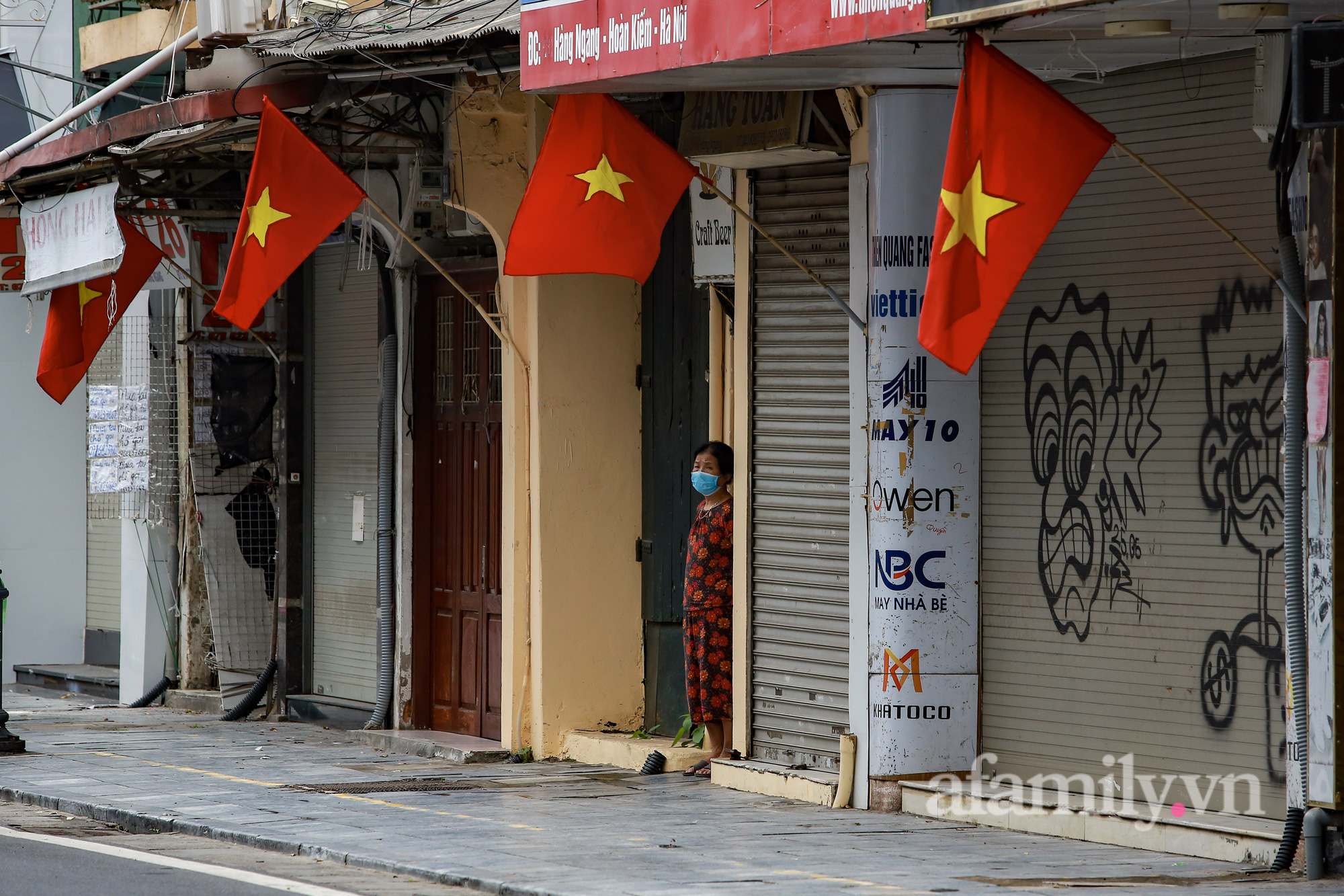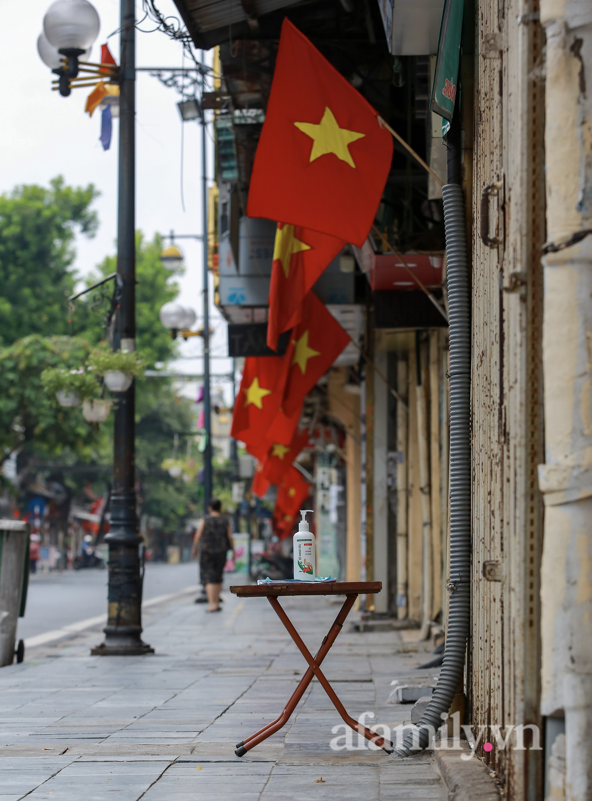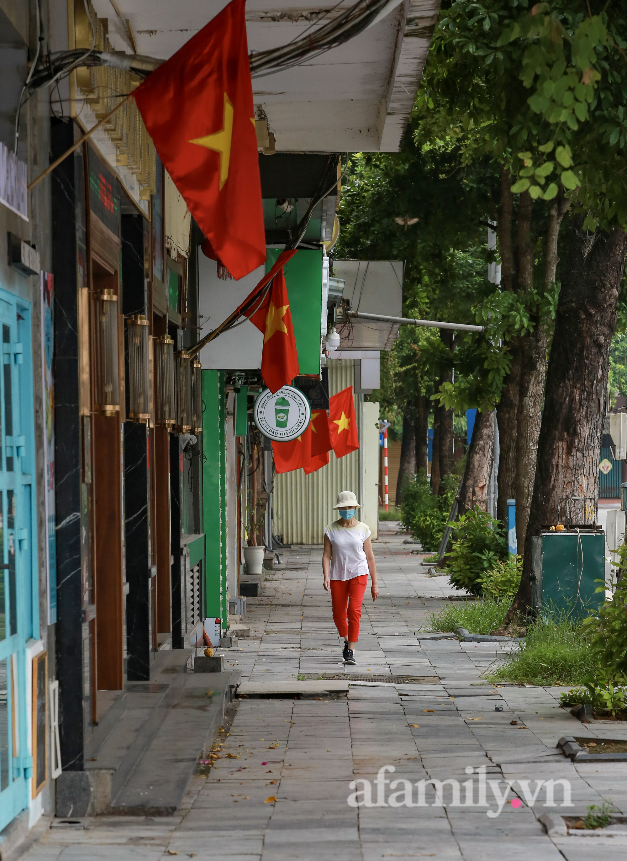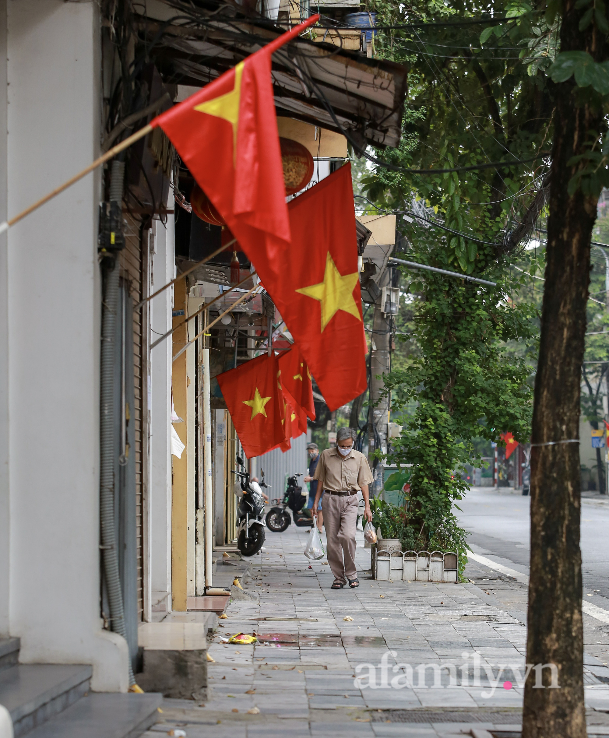 Quốc khánh năm nay đúng vào thời điểm Hà Nội đang thực hiện giãn cách xã hội để phòng dịch. Đường phố vẫn được trang hoàng bằng sắc đỏ quốc kỳ, nhưng không ai ra ngoài cả.