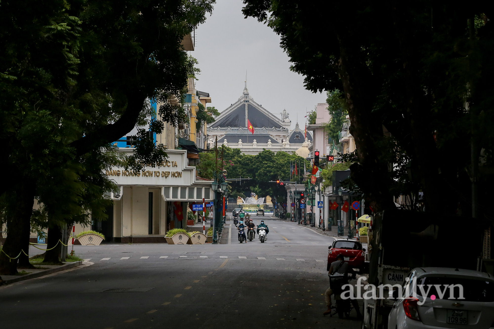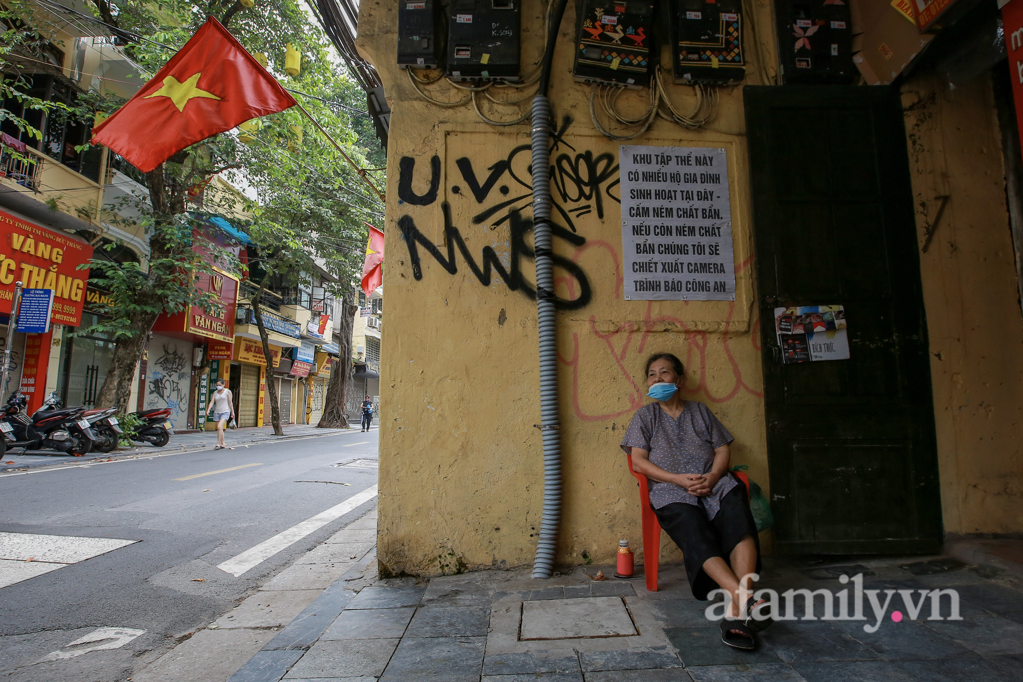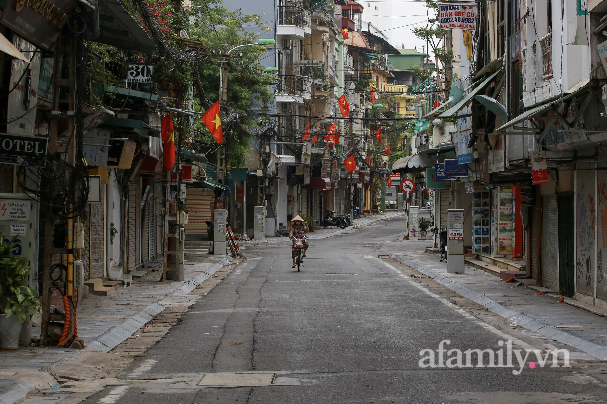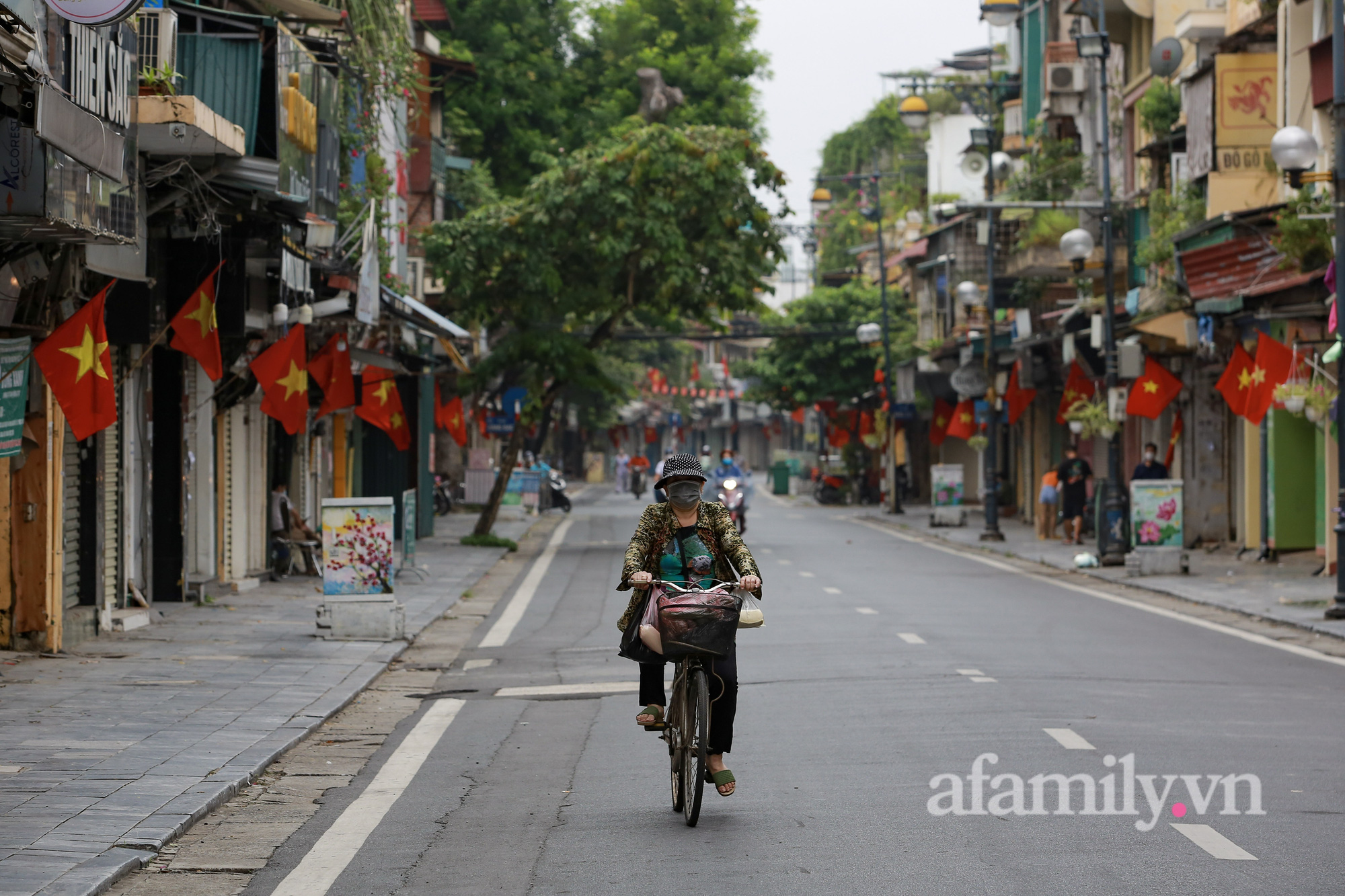 Quốc khánh năm nay đúng vào thời điểm Hà Nội đang thực hiện giãn cách xã hội để phòng dịch. Đường phố vẫn được trang hoàng bằng sắc đỏ quốc kỳ, nhưng không ai ra ngoài cả.