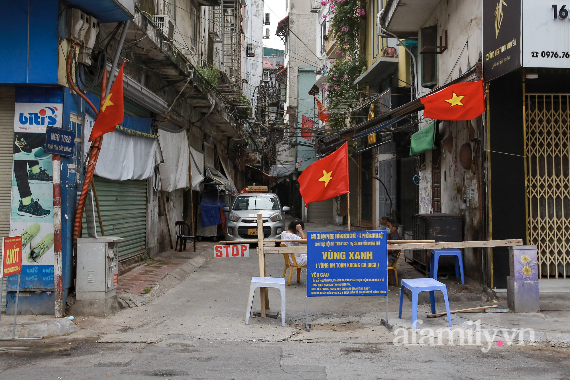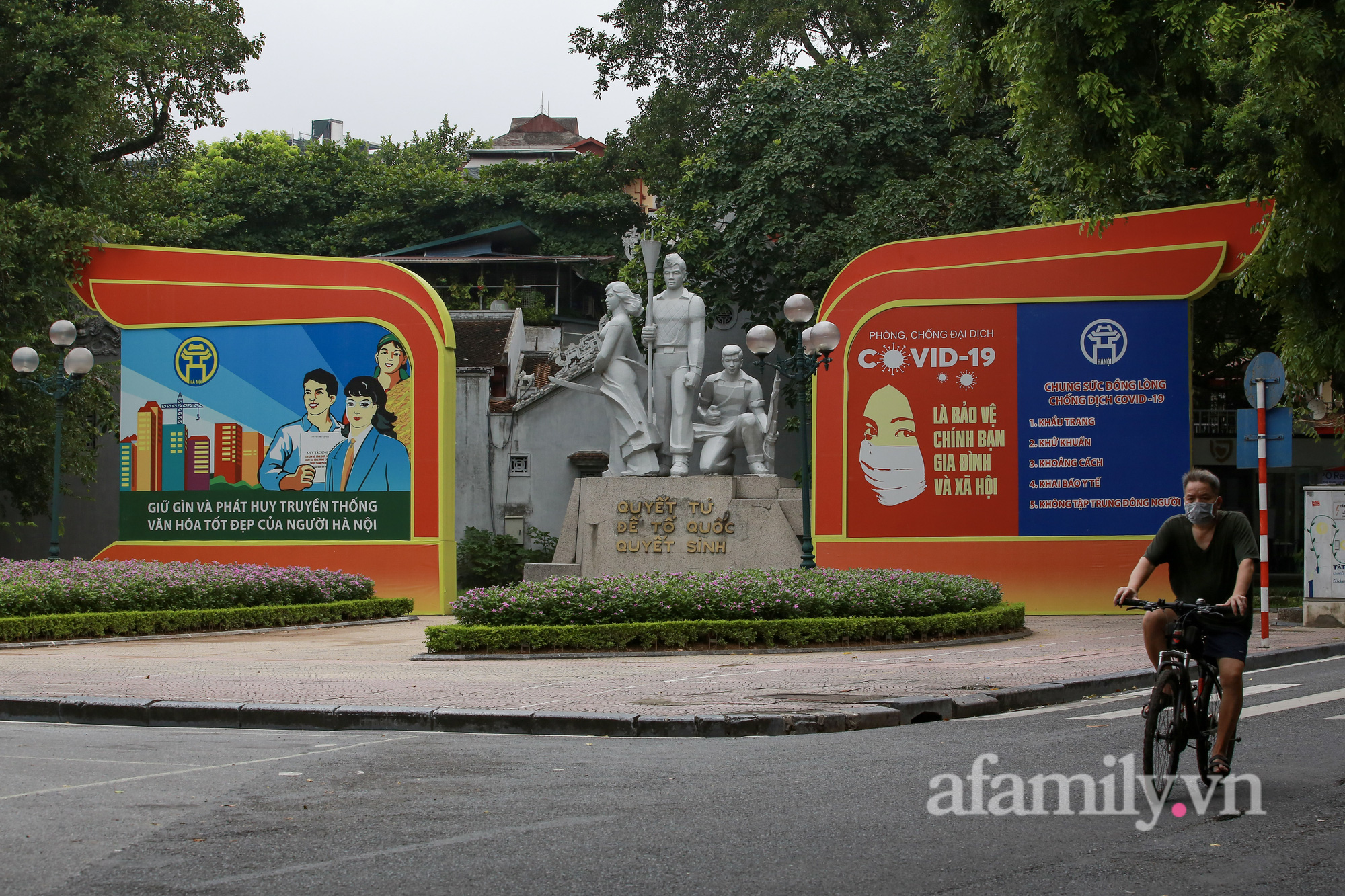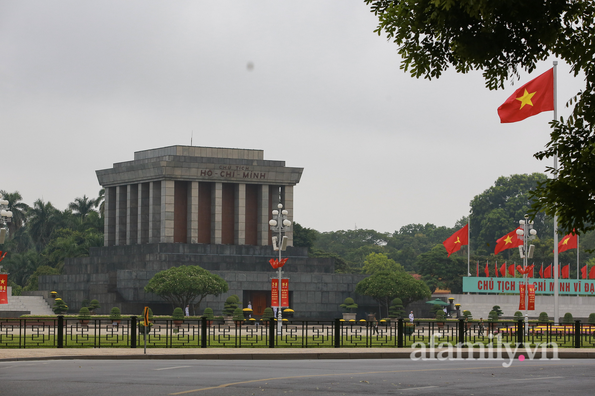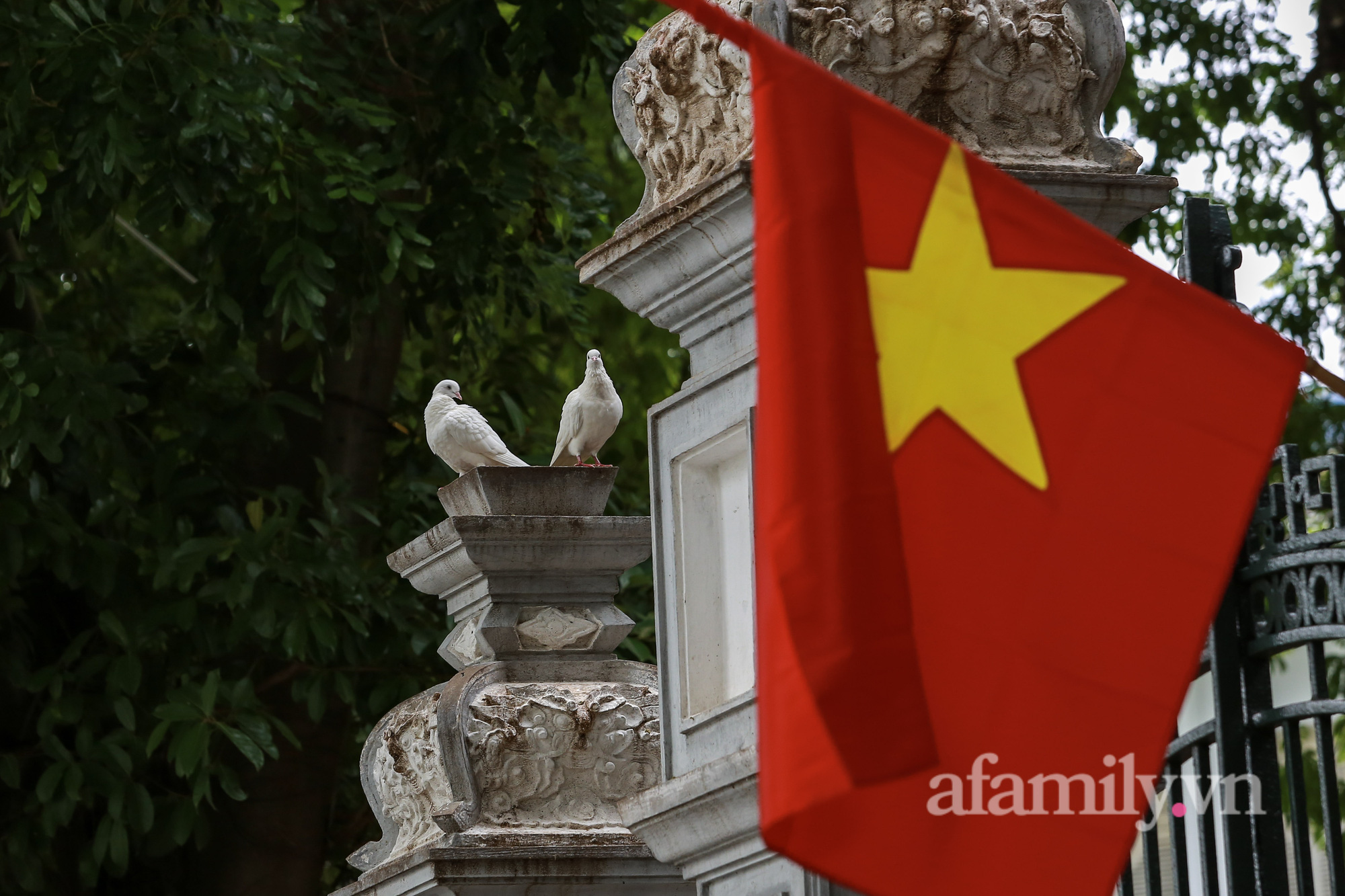Quốc khánh năm nay đúng vào thời điểm Hà Nội đang thực hiện giãn cách xã hội để phòng dịch. Đường phố vẫn được trang hoàng bằng sắc đỏ quốc kỳ, nhưng không ai ra ngoài cả.
