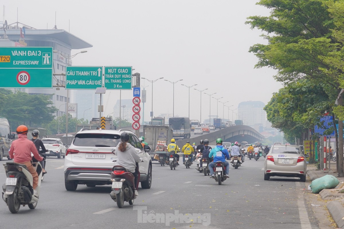 Tại khu nút giao Mai Dịch, bầu trời mịt mù, nhiều toà nhà cao tầng ẩn hiện trong sương.