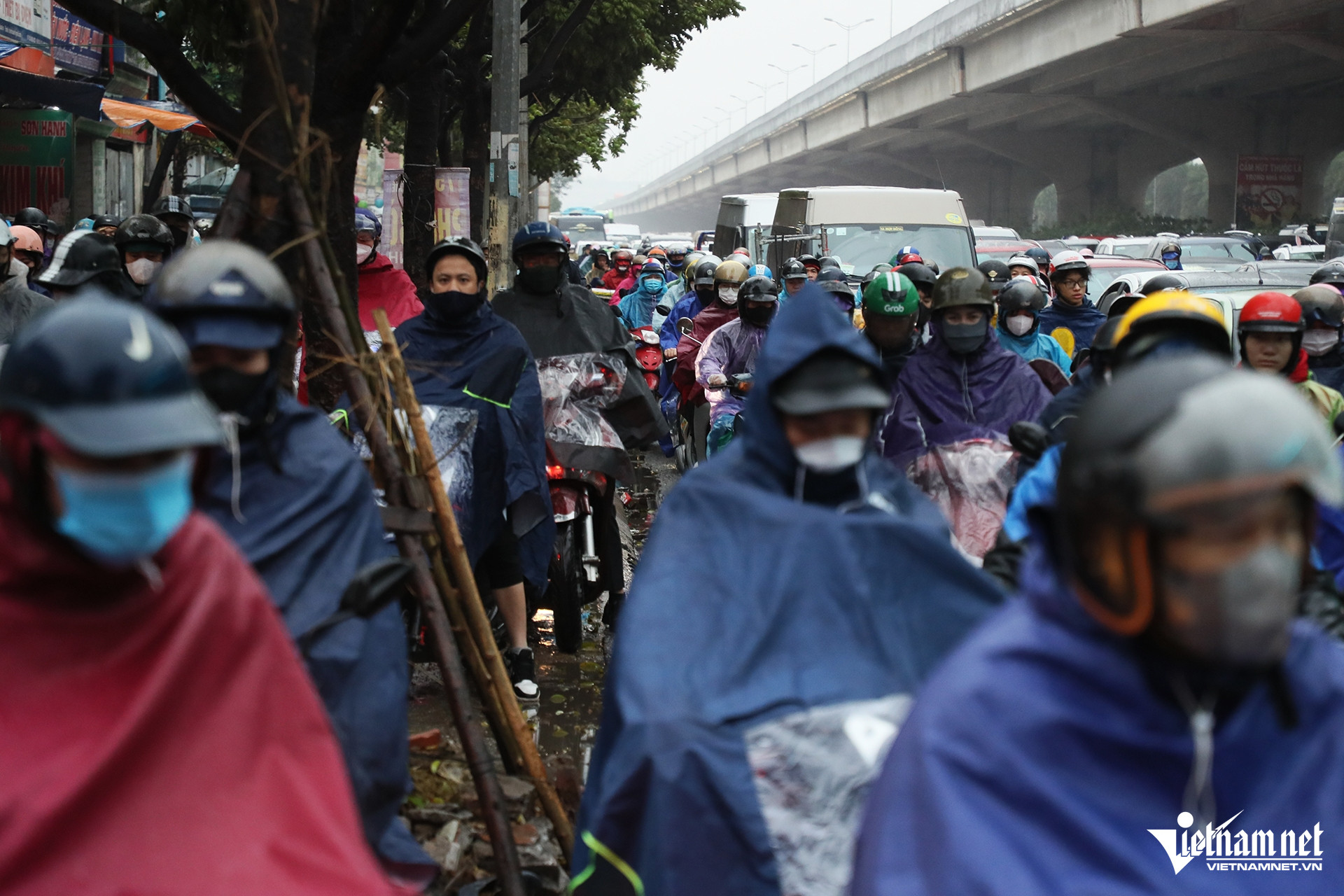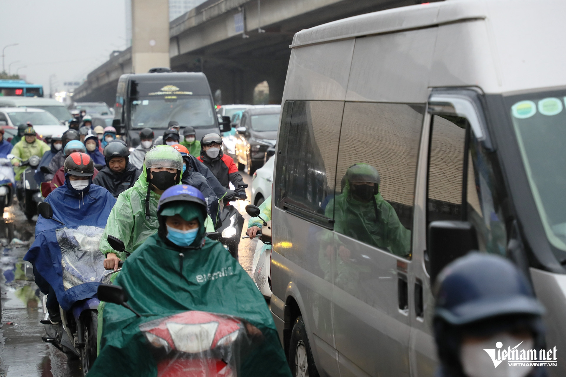 Mưa phùn vào giờ cao điểm khiến việc di chuyển của người dân gặp khó khăn. Nhiều tuyến đường ở Hà Nội ùn tắc. Người đi xe máy đã tràn lên vỉa hè để "thoát" ùn tắc.