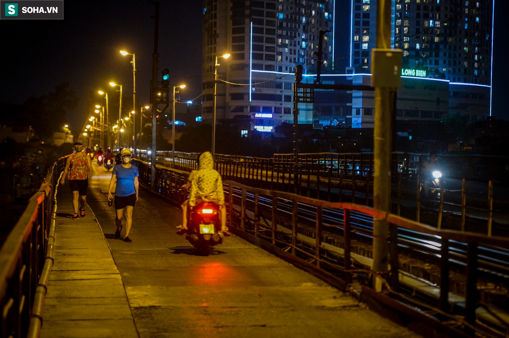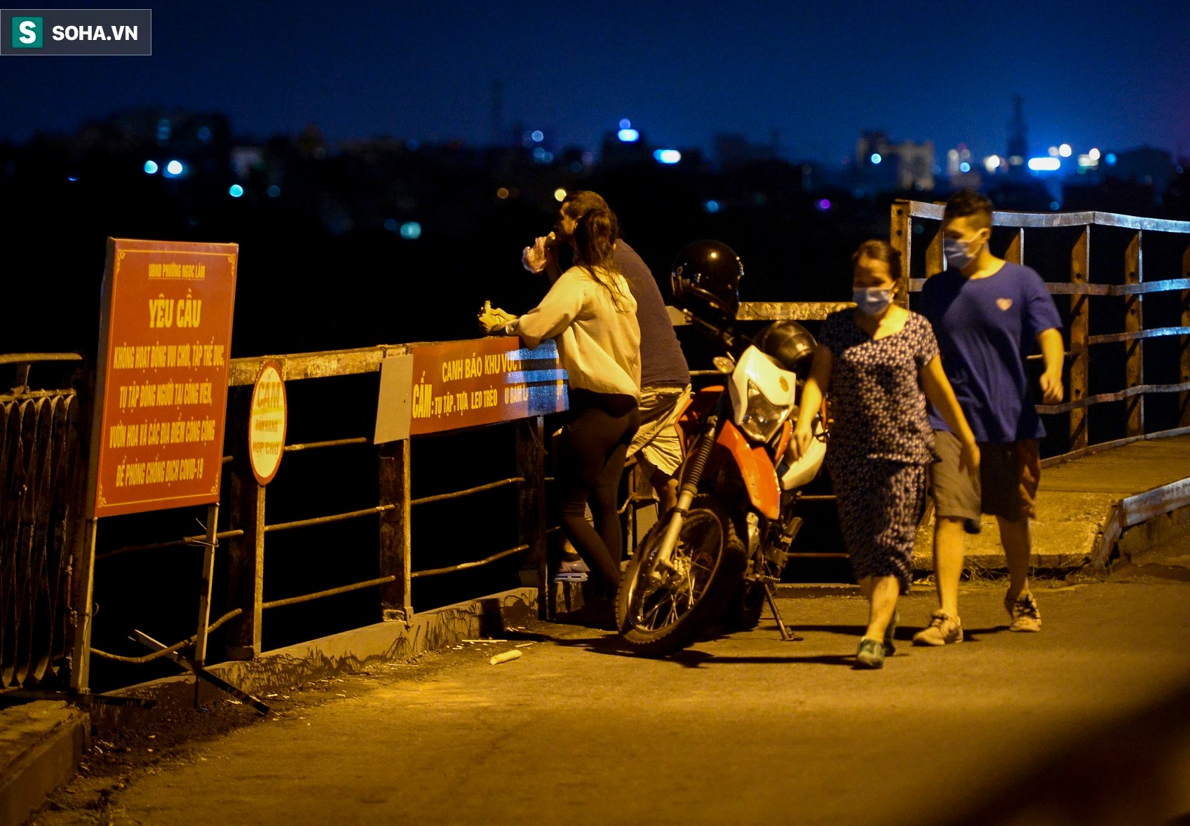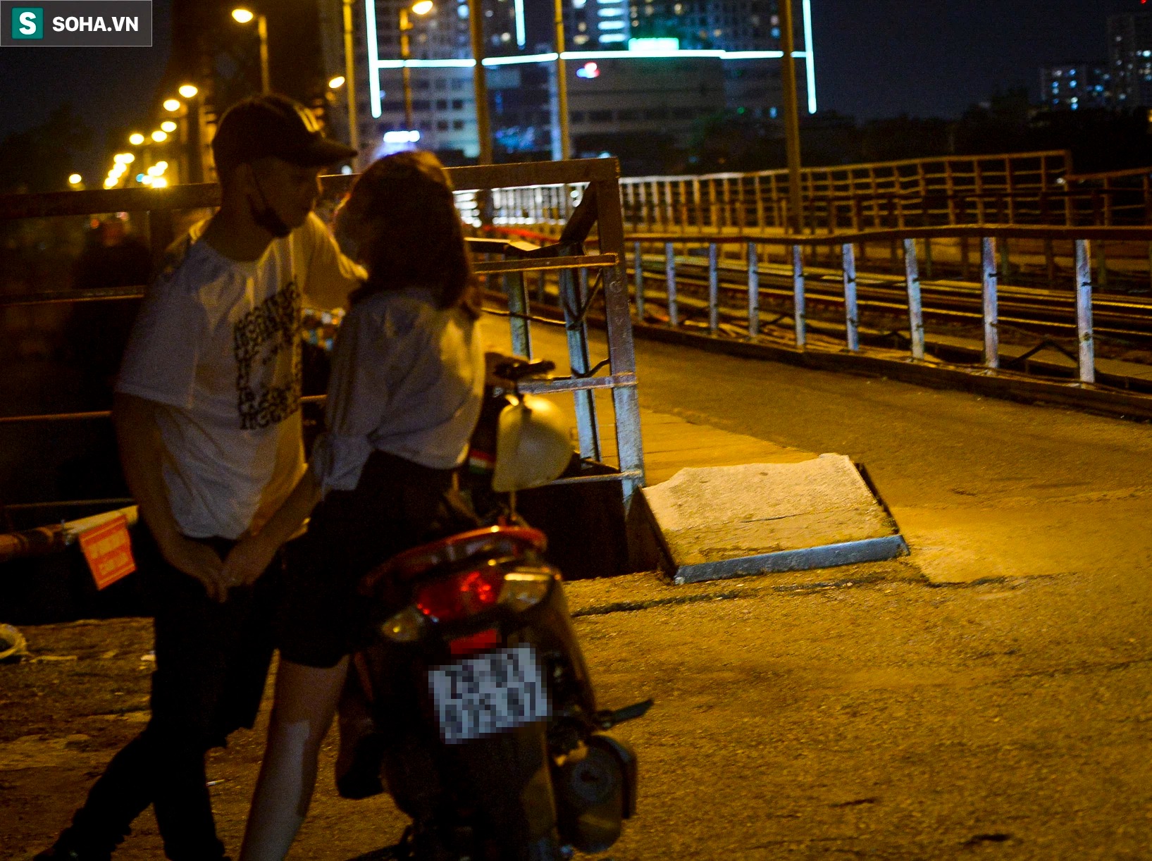 Mặc dù Hà Nội đang giãn cách xã hội nhưng vào tối 18/9, tại cầu Long Biên có hàng chục người đi bộ tập thể và nhiều đôi nam nữ ngồi tâm sự, có người còn vào giữa đường tàu tạo dáng chụp ảnh.