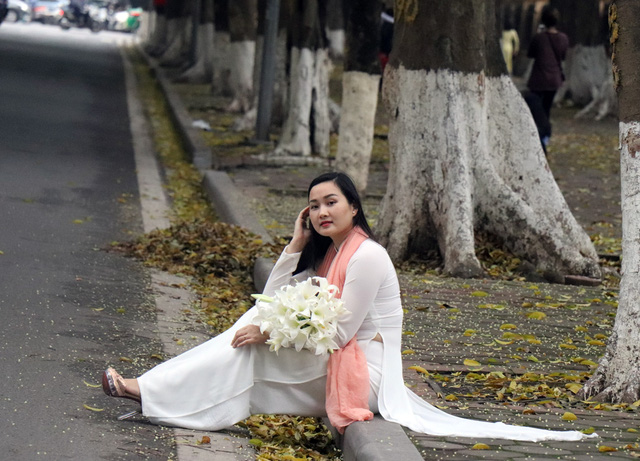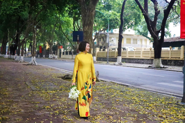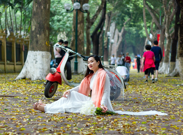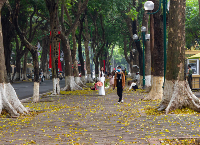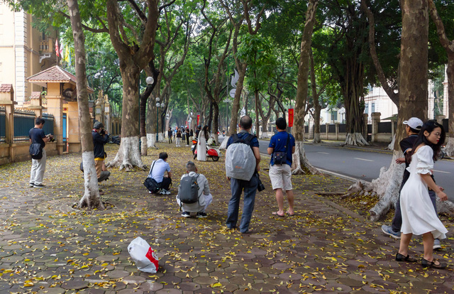 Mùa sấu rụng lá vô tình tạo nên những thảm lá vàng ruộm dưới chân khiến đông đảo người dân kéo đến tạo dáng chụp ảnh.