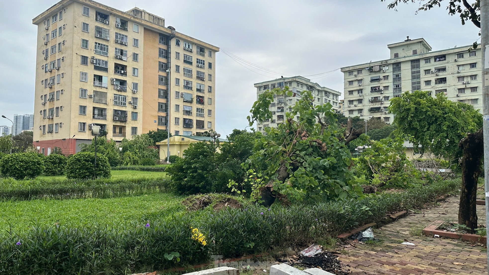 Tại nhiều khu đô thị trên địa bàn Hà Nội vẫn còn ngổn ngang cây cối gãy đổ sau cơn bão số 3, chưa có người dọn dẹp. Trong khi ở khu đô thị Trung Văn, người dân phản ánh tình trạng cây xanh bị cắt tận gốc dù sống sót sau bão.