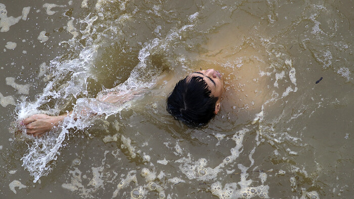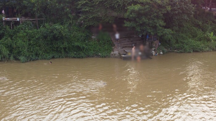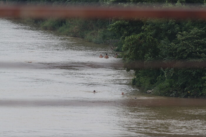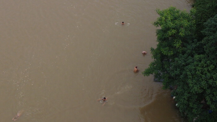 Chiều 25/7, Hà Nội đang trong thời gian giãn cách xã hội, yêu cầu không ra khỏi nhà nếu không thật sự cần thiết nhưng tại bãi tắm tự phát ngay dưới chân cầu Long Biên, nhiều người vẫn đổ xô tới đây tắm sông.