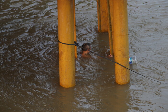 Dưới đây là một số hình ảnh chúng tôi ghi nhận được vào chiều 25/7 tại bãi tắm tự phát dưới chân cầu Long Biên, ven sông Hồng: