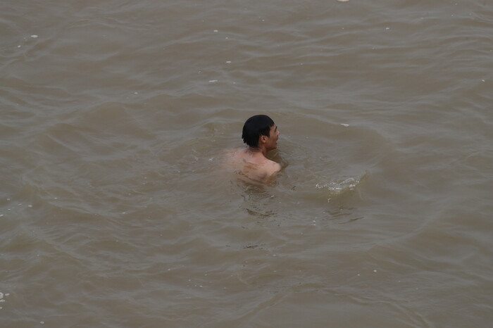 Bãi tắm tiên dưới chân cầu Long Biên từ lâu đã trở thành điểm ưa thích của nhiều người dân Hà Nội đến để tập thể dục, bơi lội. Những ngày này, thời tiết ở Hà Nội không quá oi nóng nhưng nhiều người vẫn đến đây bơi lội.