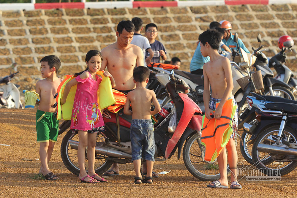Tại khu vực đập nước Quán Trăn, xã Tân Xã, huyện Thạch Thất, Hà Nội, khi trời còn chưa ngớt nắng, hàng trăm người mang theo phao, can nhựa, hộp xốp nườm nượp kéo tới bơi lội.