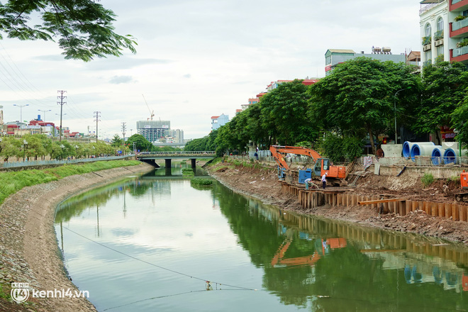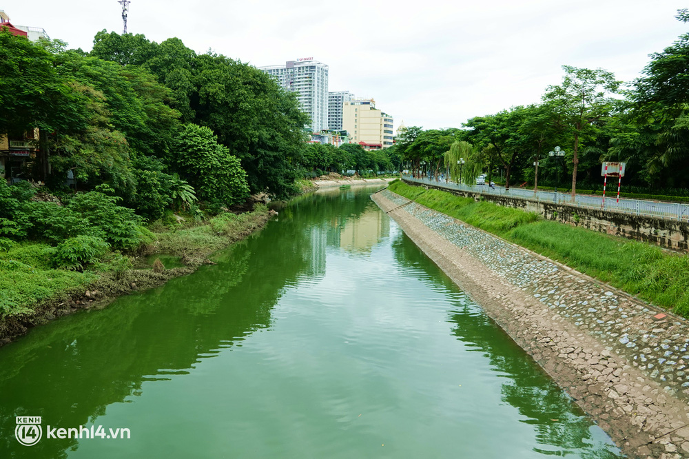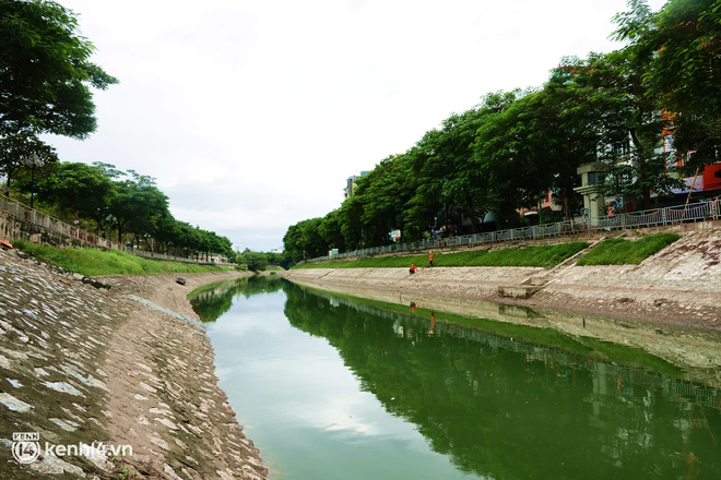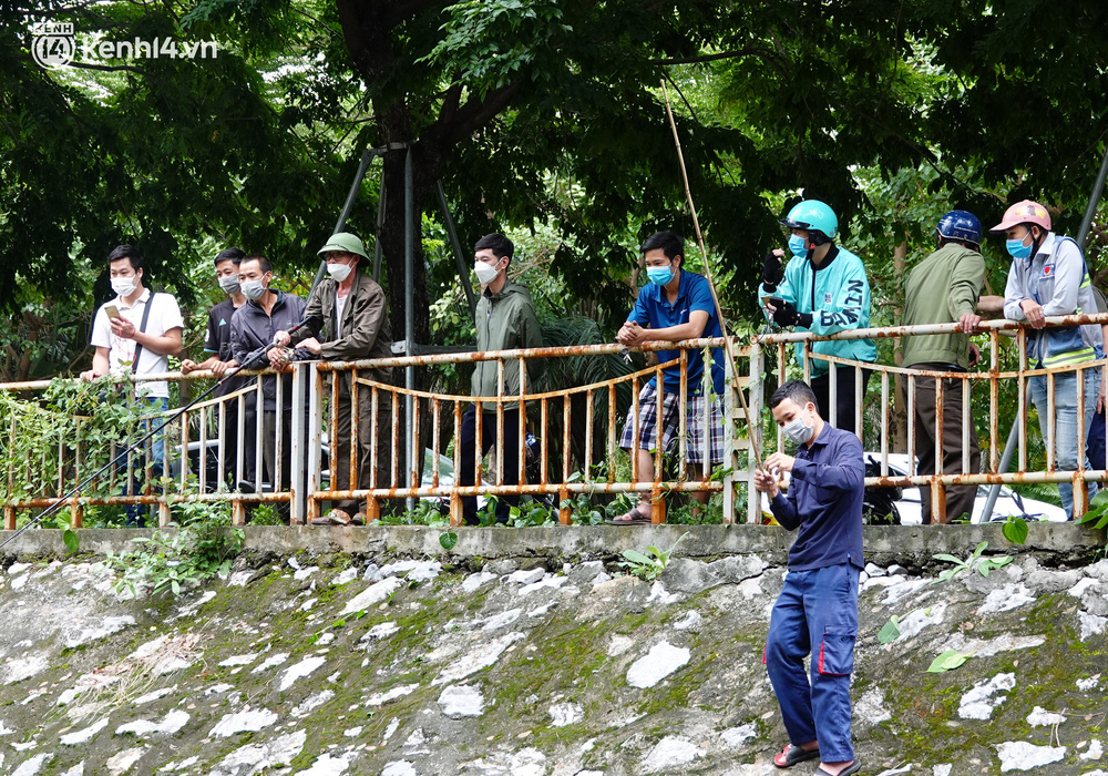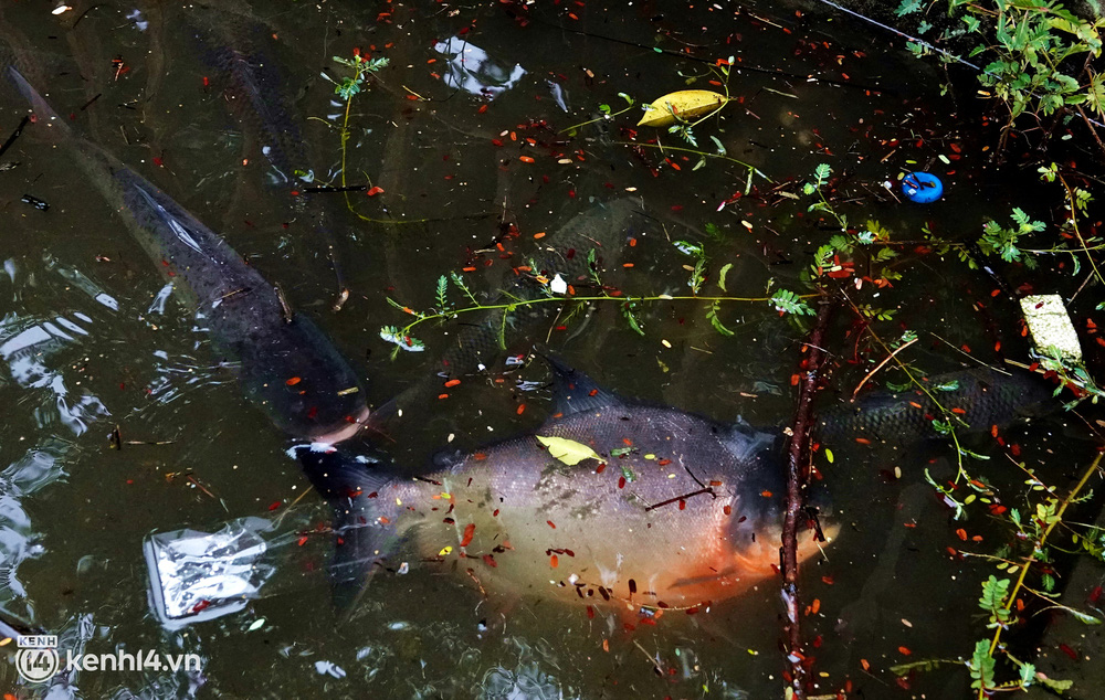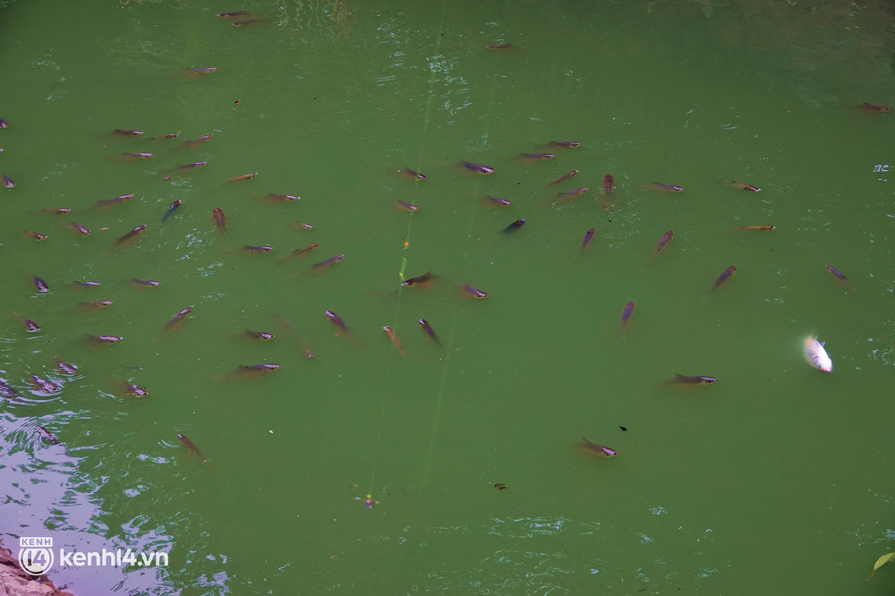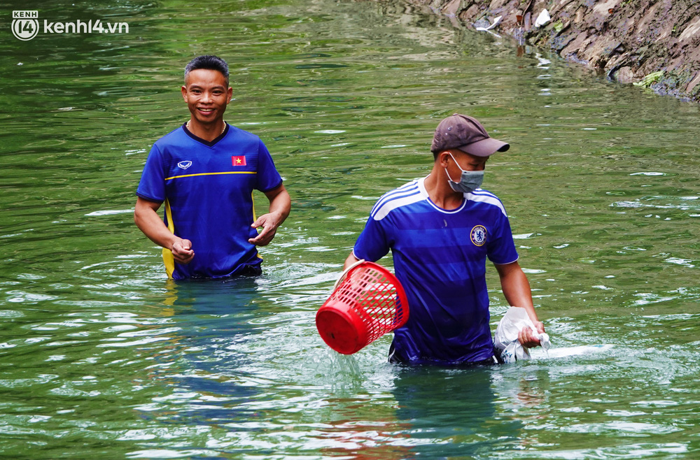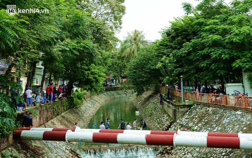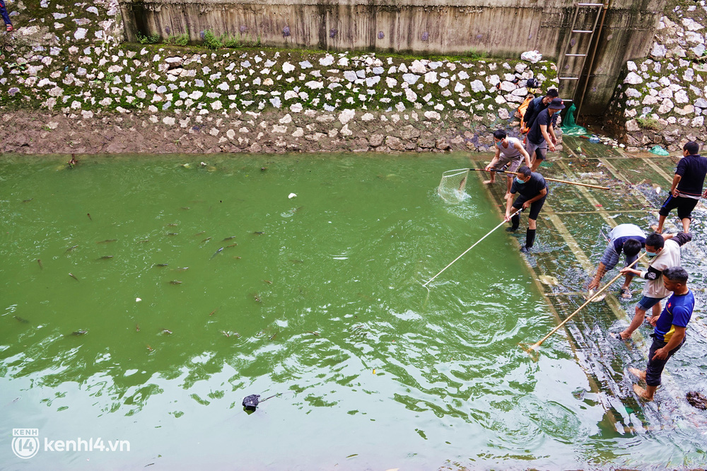Sáng 13/10, màu nước sông Tô Lịch chuyển màu xanh ngắt, kèm theo đó rất nhiều loại cá nổi lên mặt nước khiến người dân mang nhiều vật dụng ra bắt cá.