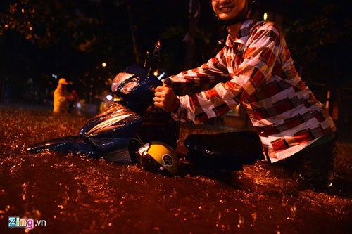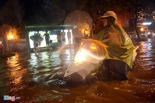 Trục đường Huỳnh Thúc Kháng, Thái Hà ngập rất sâu. Nhiều phụ nữ yếu tay lái dắt xe bộ khó khăn trong dòng nước. Ảnh: Anh Tuấn. |