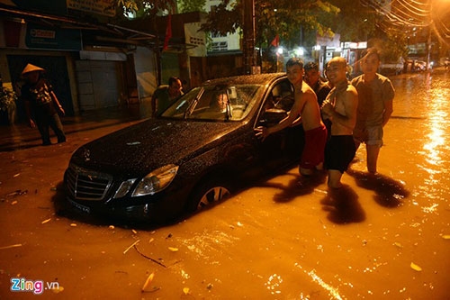 Tại khu tập thể Thành Công, nhiều xe hơi cũng phải cần sự trợ giúp của nhóm thanh niên đẩy ra khỏi khu vực ngập. Ảnh: Anh Tuấn. |